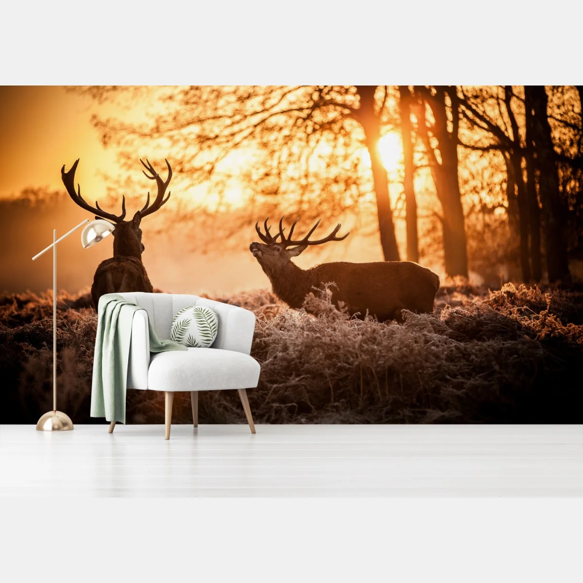 Fototapete Goldener sonnenaufgang mit hirschen auf frostiger wiese