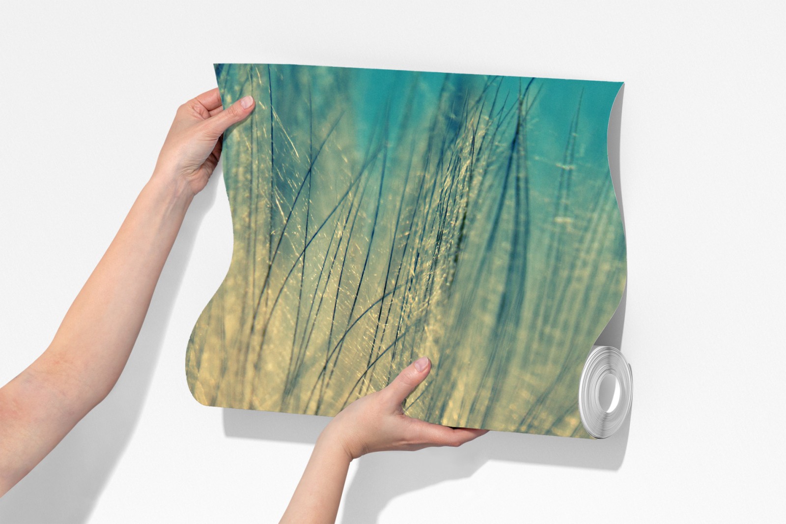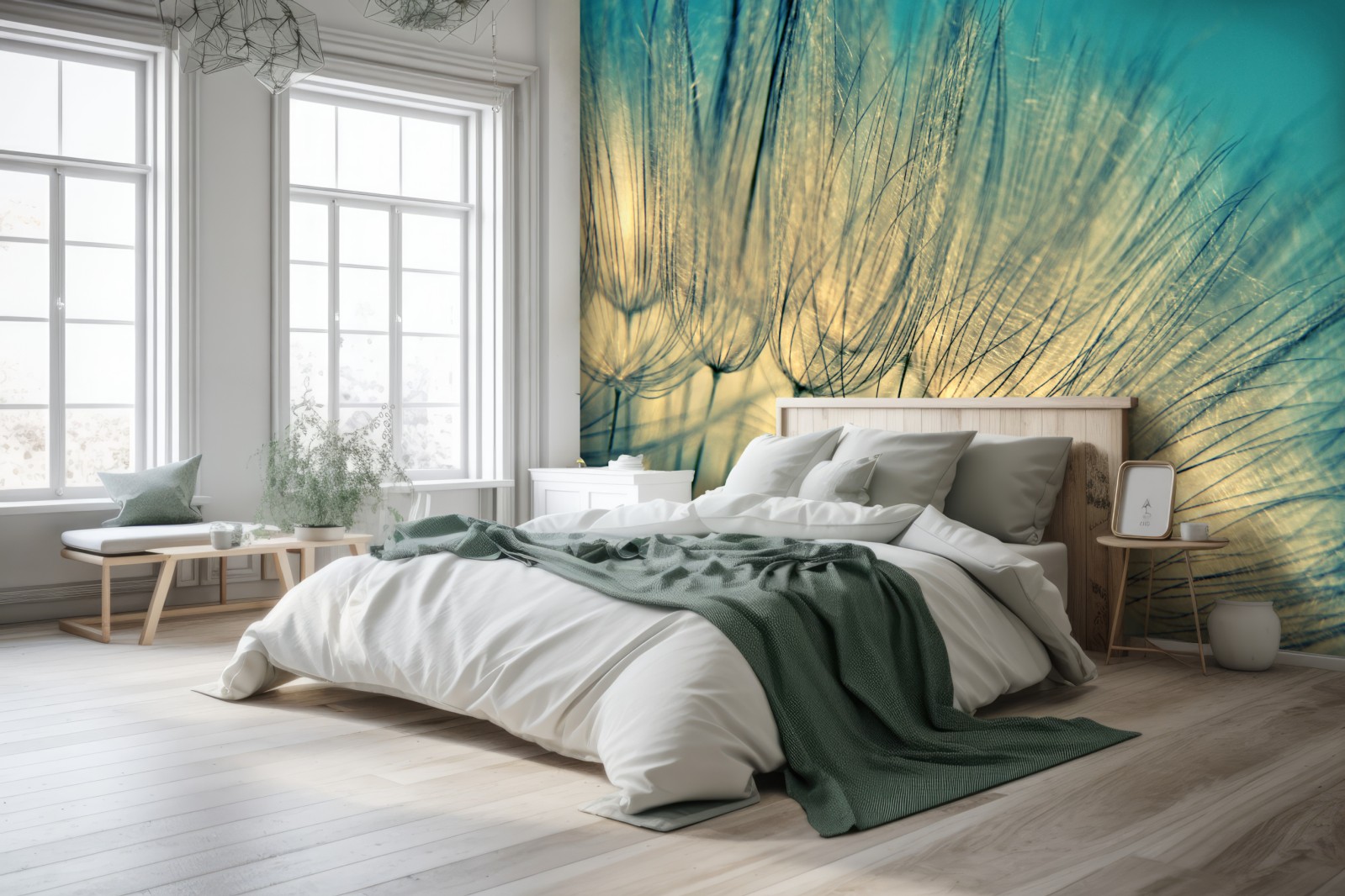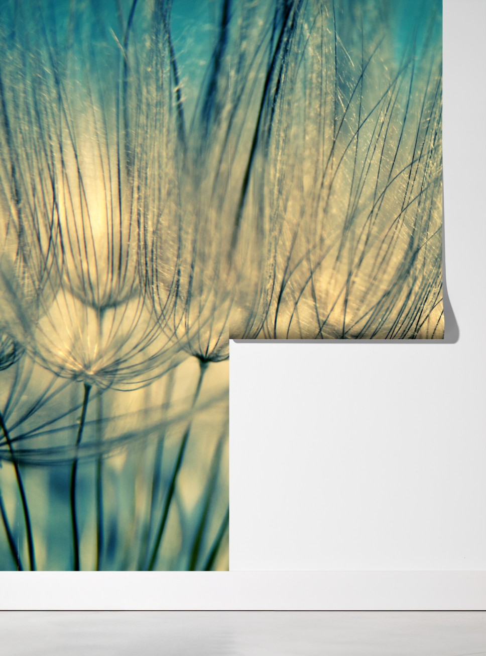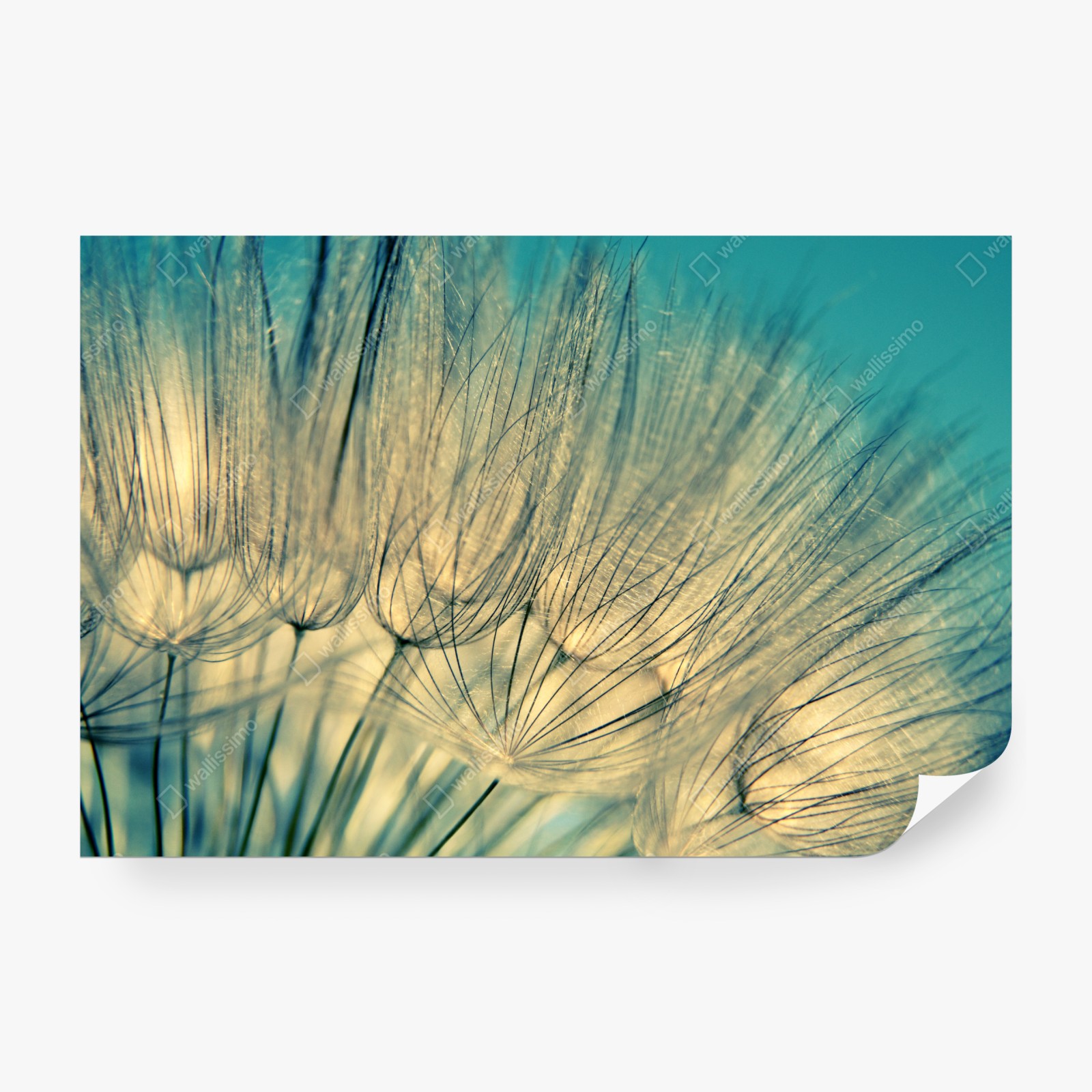 Nahaufnahme von löwenzahnsamen in pastell-türkisen tönen schafft eine luftige, natürliche eleganz für jede wand.