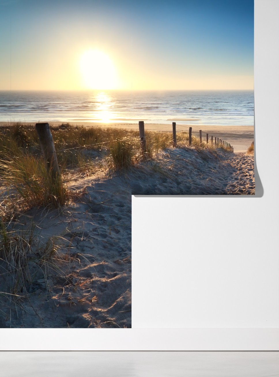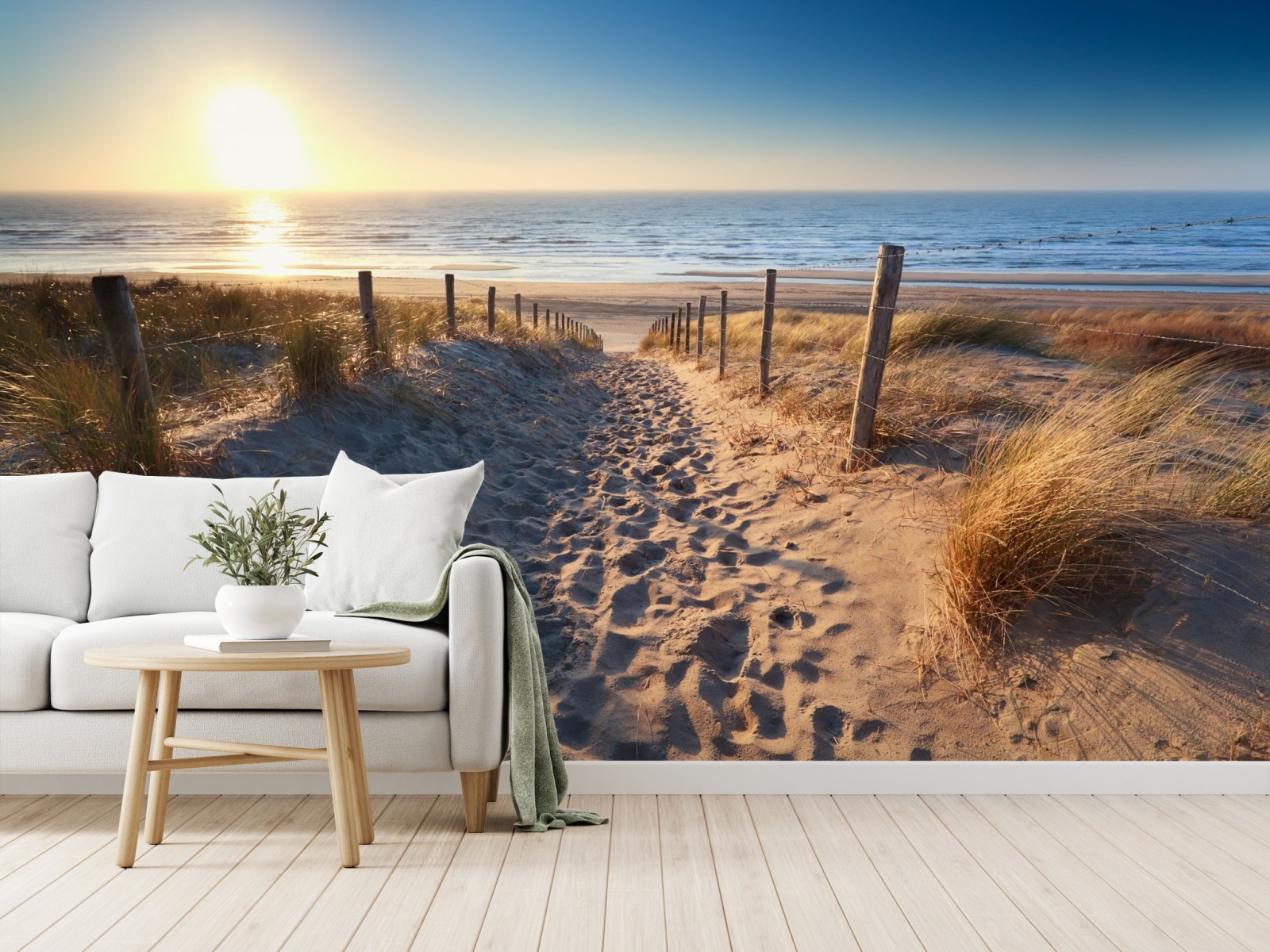 Ruhige Küstenlandschaft mit einem sandigen Pfad durch Dünen zum Nordseeufer, warmes Licht und beruhigende Farben für jede Einrichtung.