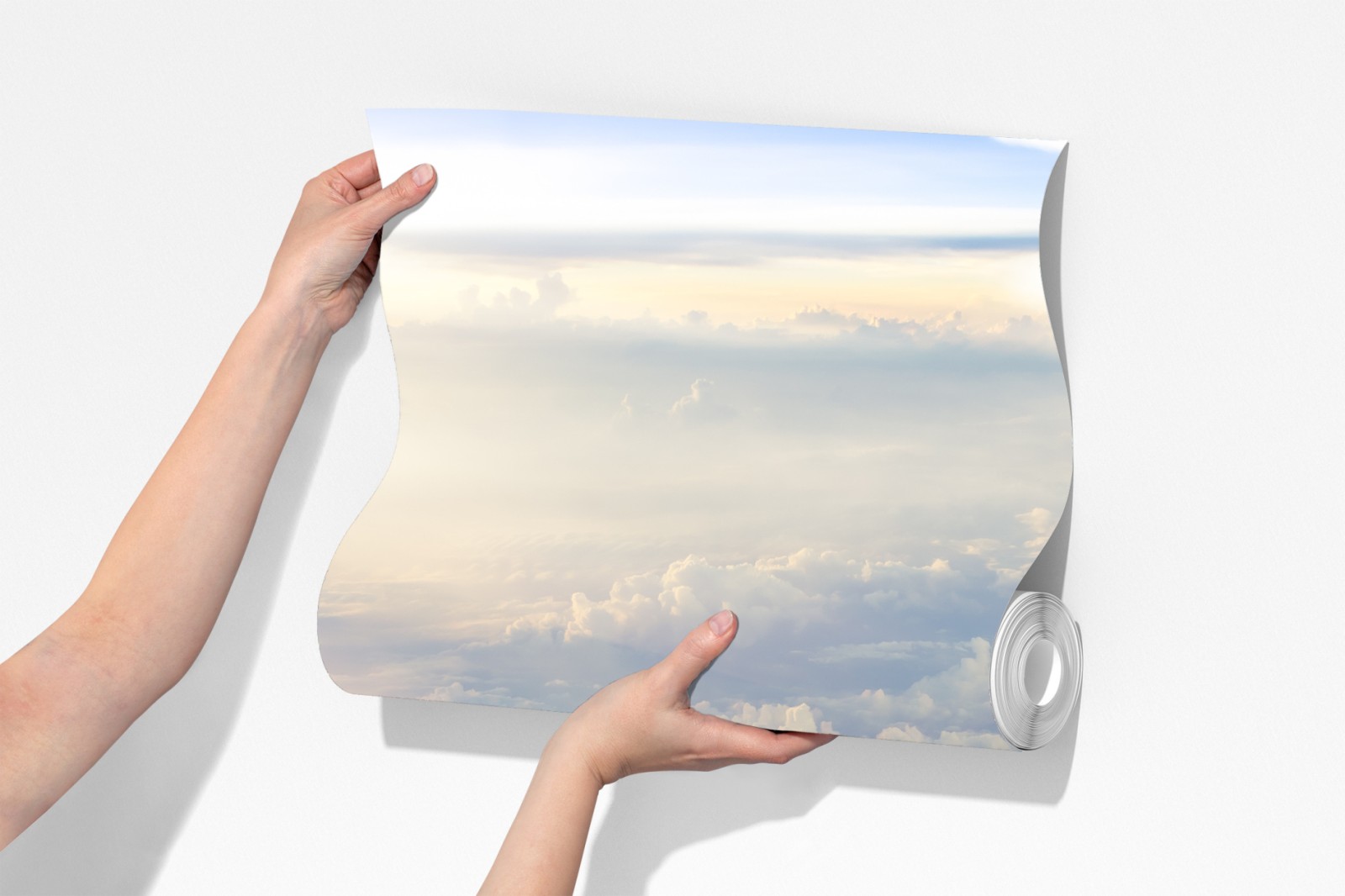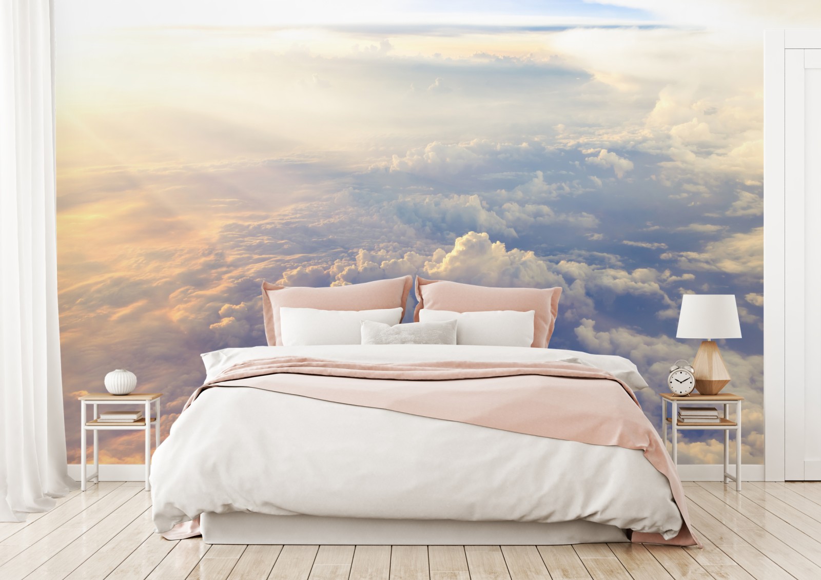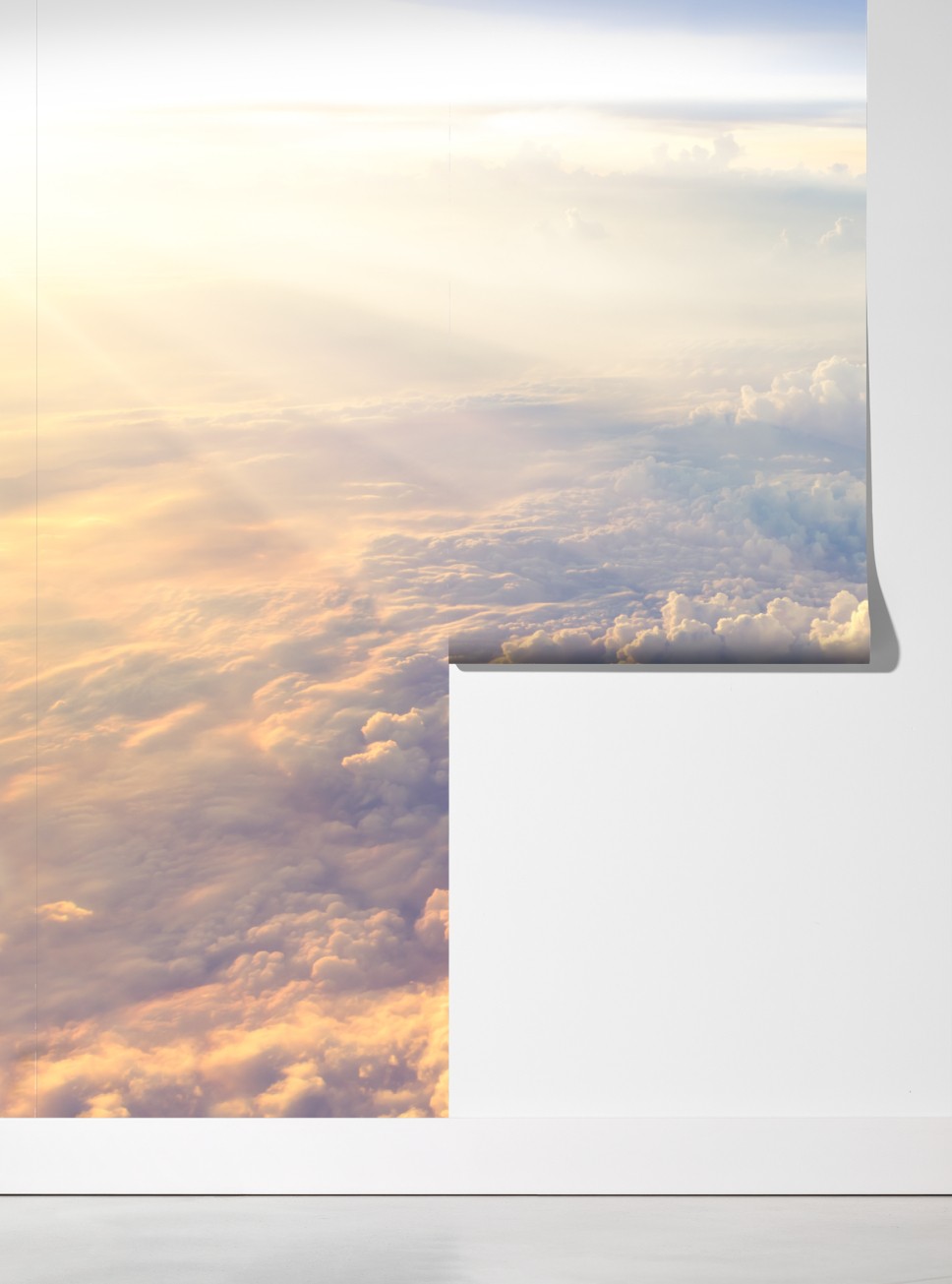 Ein ruhiger Luftblick auf sonnenbeschienene Wolken schafft ein Gefühl von Weite und Gelassenheit im Raum.