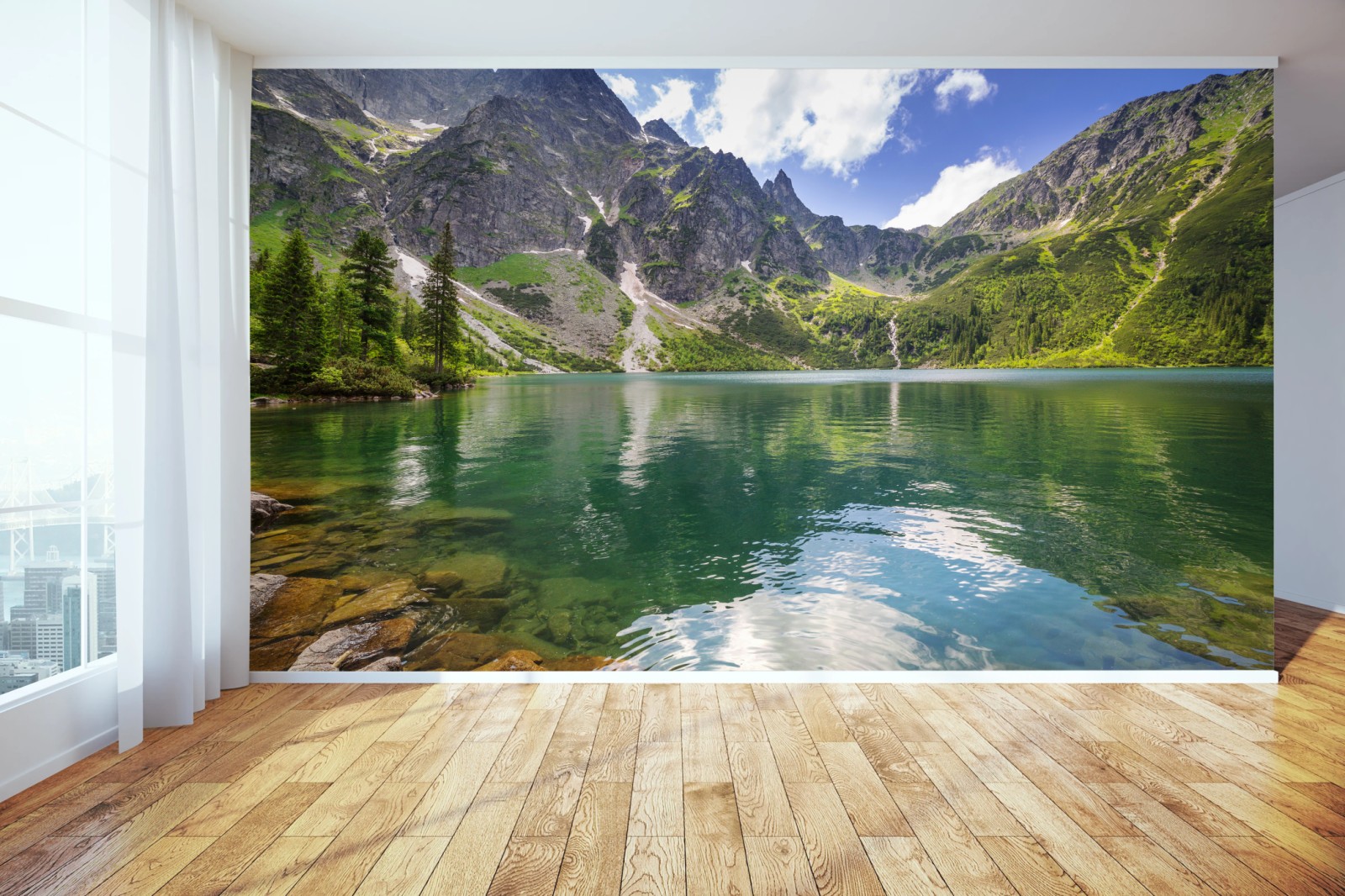 Fototapete Ruhiger smaragdgrüner bergsee vor schroffen gipfeln