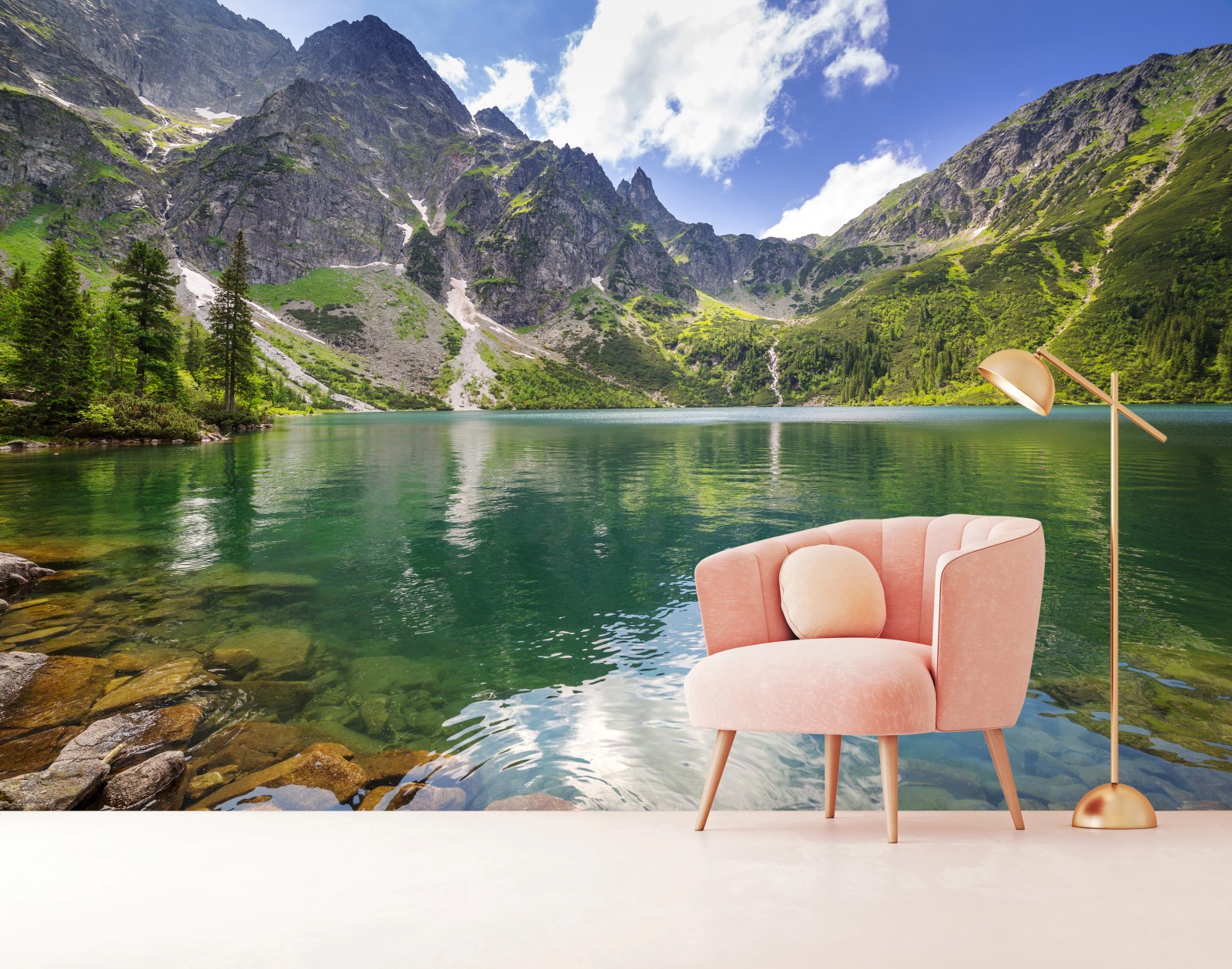 Fototapete Ruhiger smaragdgrüner bergsee vor schroffen gipfeln