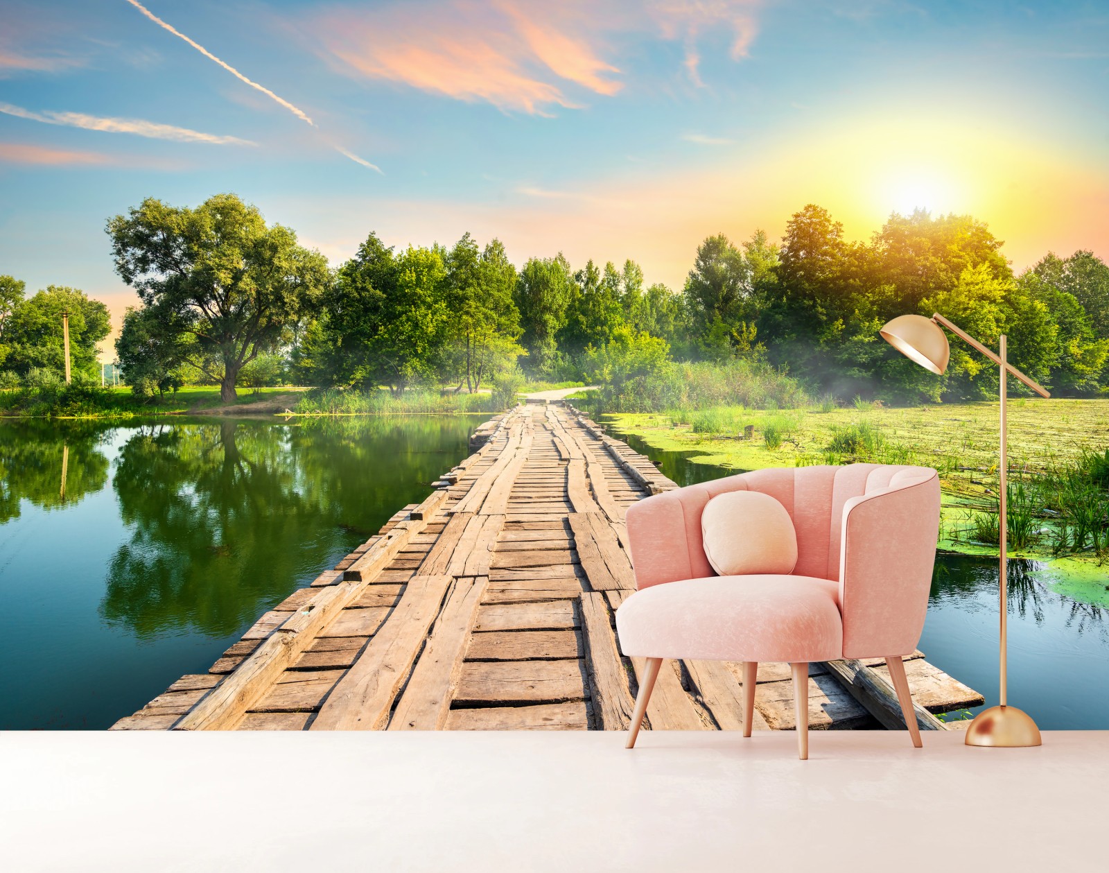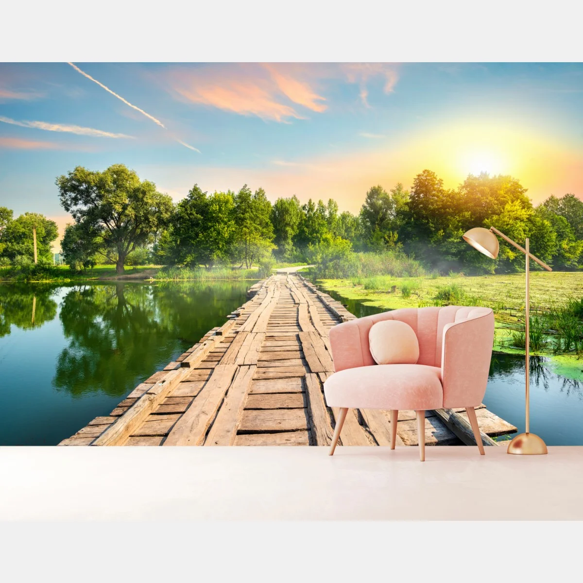 Fototapete Sonnige hölzerne brücke über ruhigen see