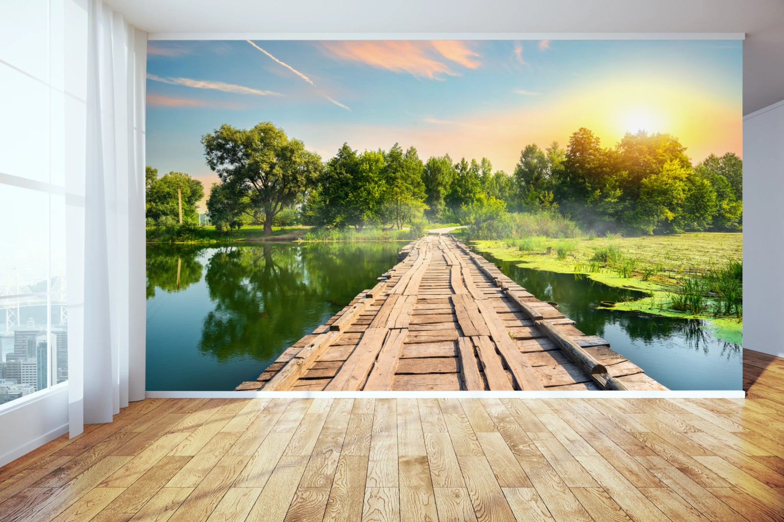 Fototapete Sonnige hölzerne brücke über ruhigen see