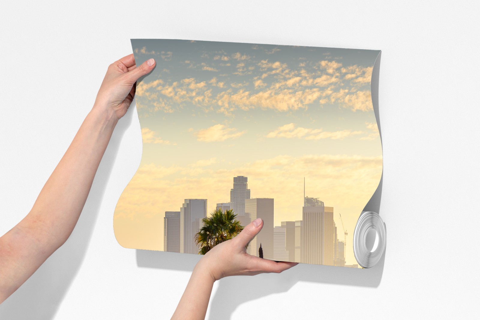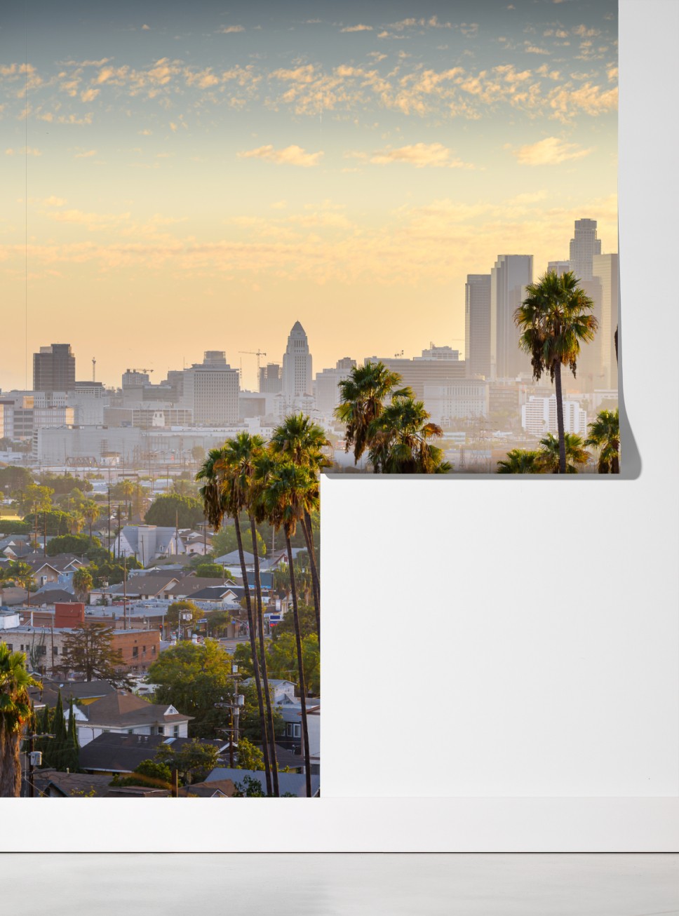 Warme goldene Stunde über der Skyline von Los Angeles, eingerahmt von hohen Palmen, die urbanen Flair und entspannte Küstenstimmung an jede Wand bringt.