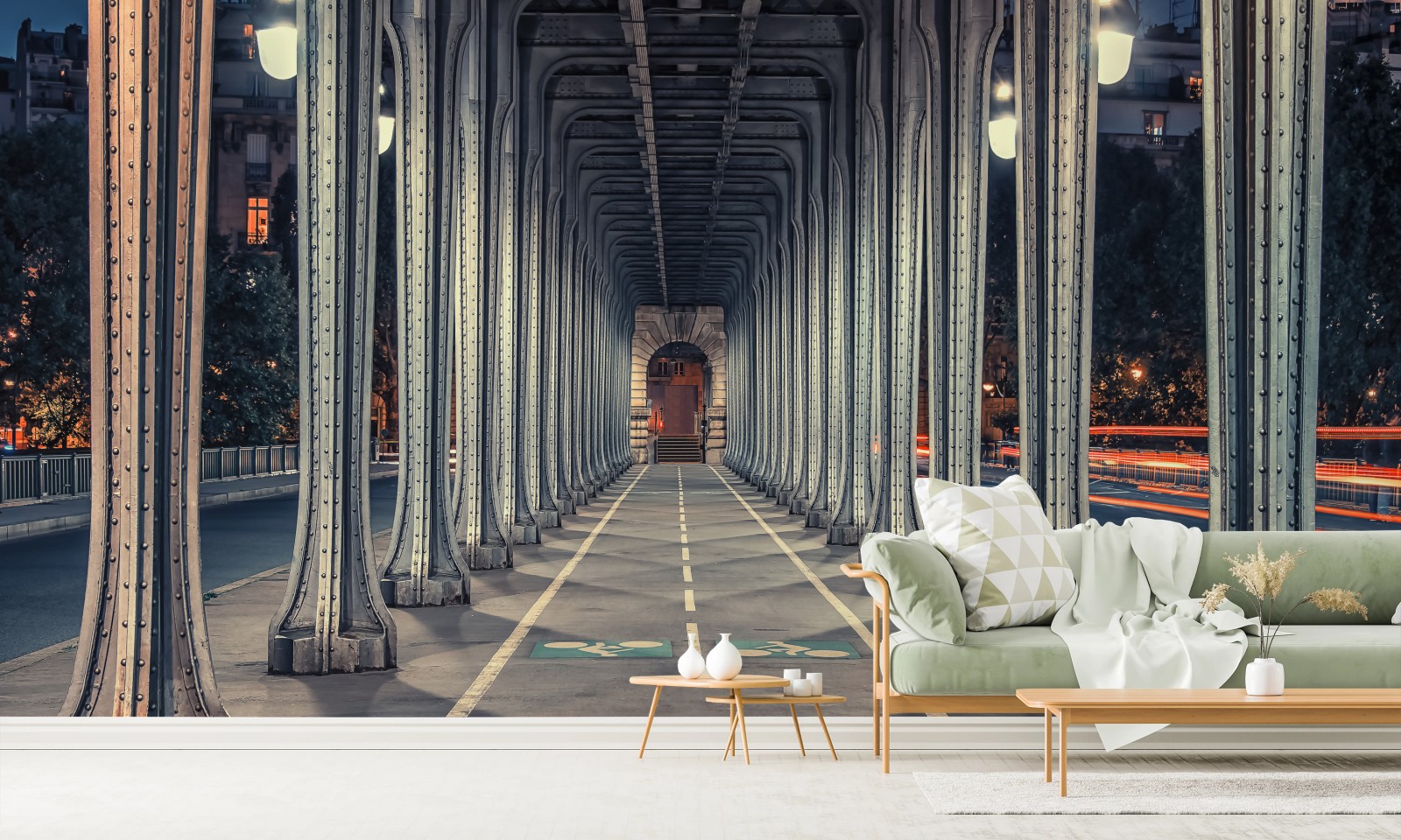 Fototapete Symmetrischer stahlkorridor einer brücke bei nacht
