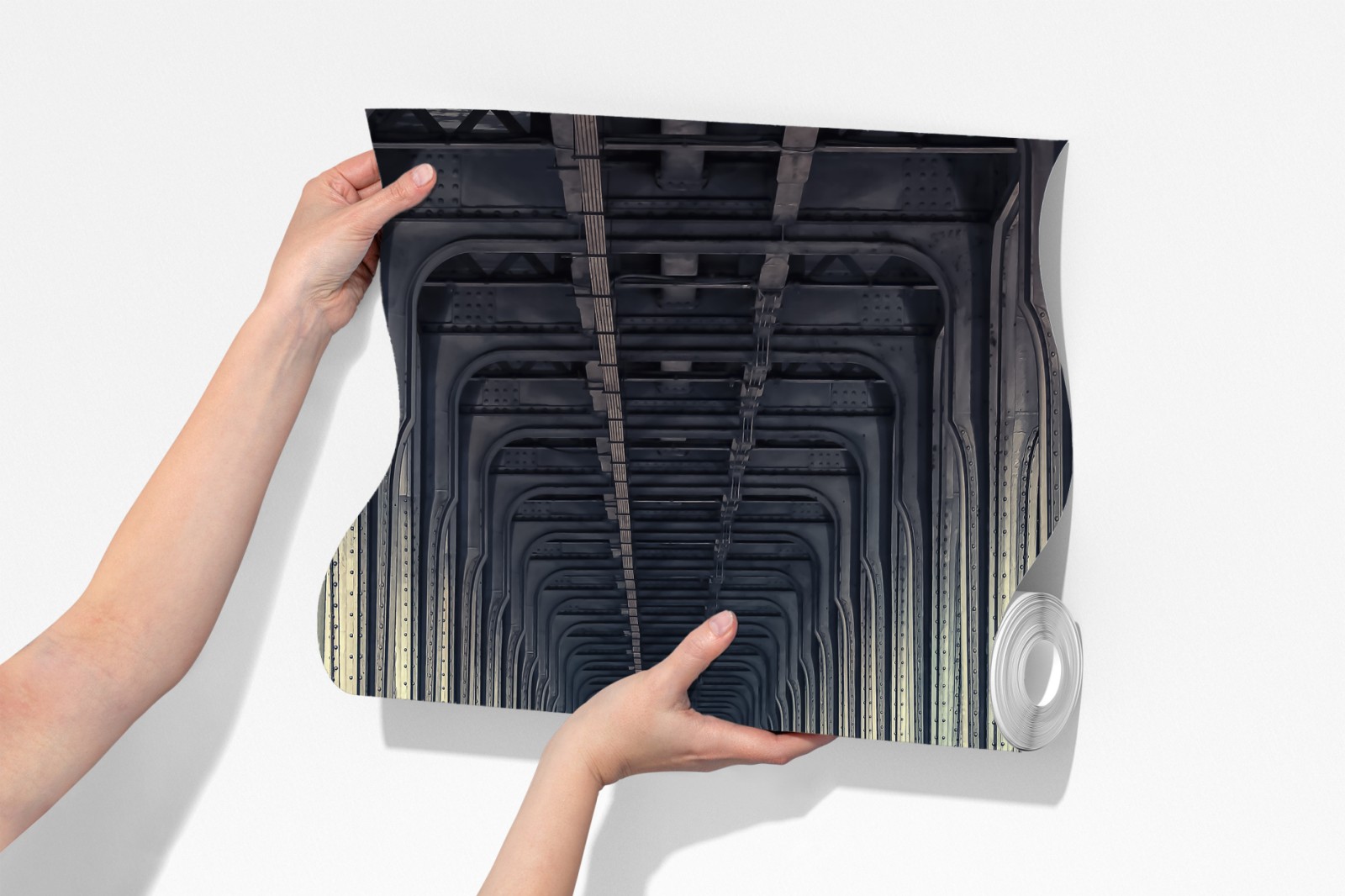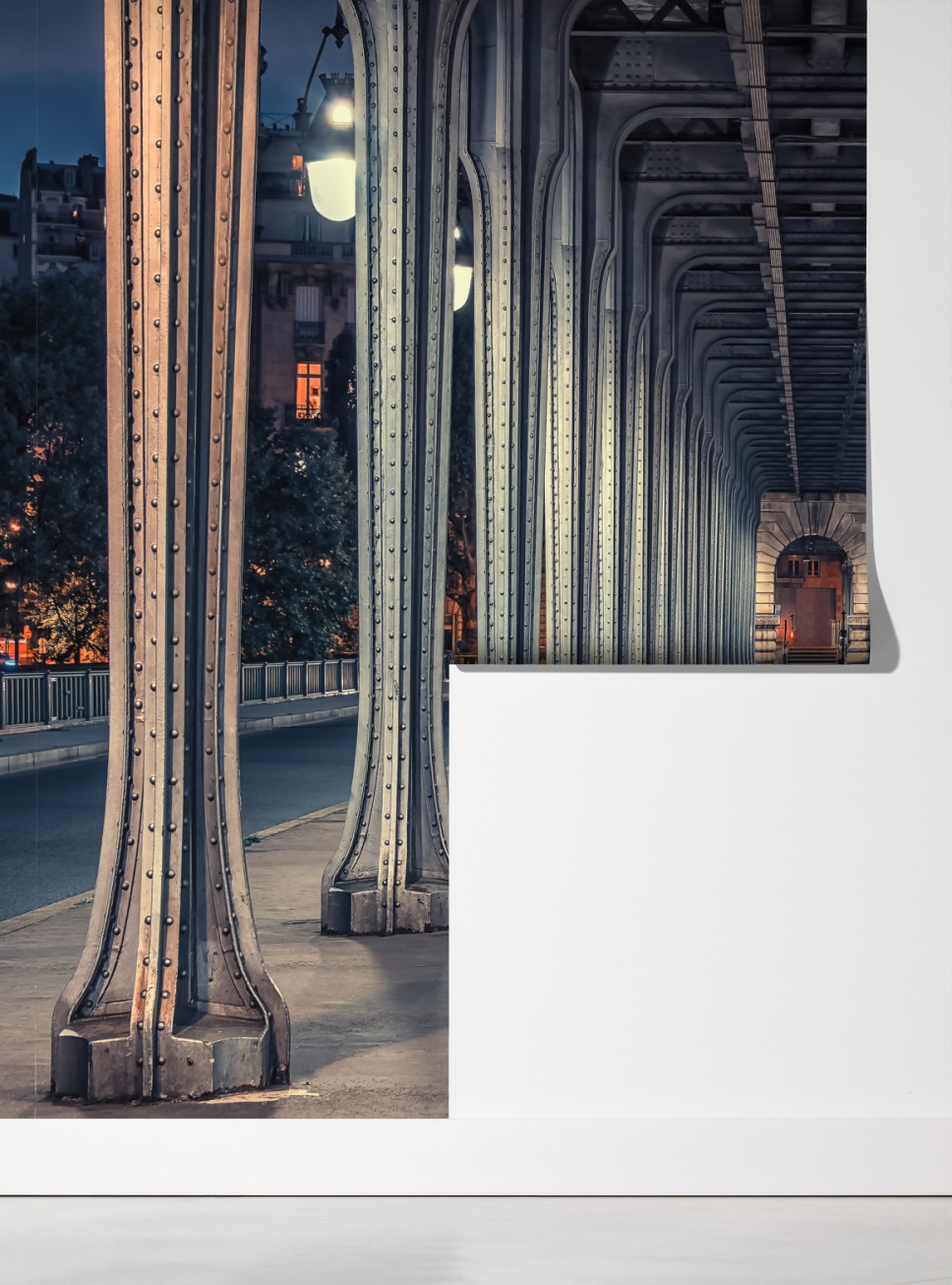 Ein eindrucksvolles Architekturfoto, das die rhythmischen Säulen und die Fluchtpunktperspektive einer Stahlbrücke bei Dämmerung einfängt und jedem Raum einen industriellen Charme verleiht.