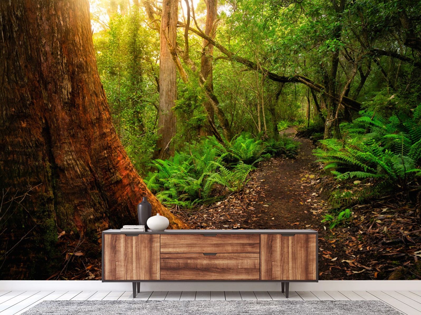 Bringen Sie die ruhige Schönheit eines uralten Regenwaldes aus Tasmanien in Ihr Zuhause mit diesem üppigen Waldweg-Motiv, ideal zur Schaffung einer natürlichen, beruhigenden Atmosphäre.MehrWeniger