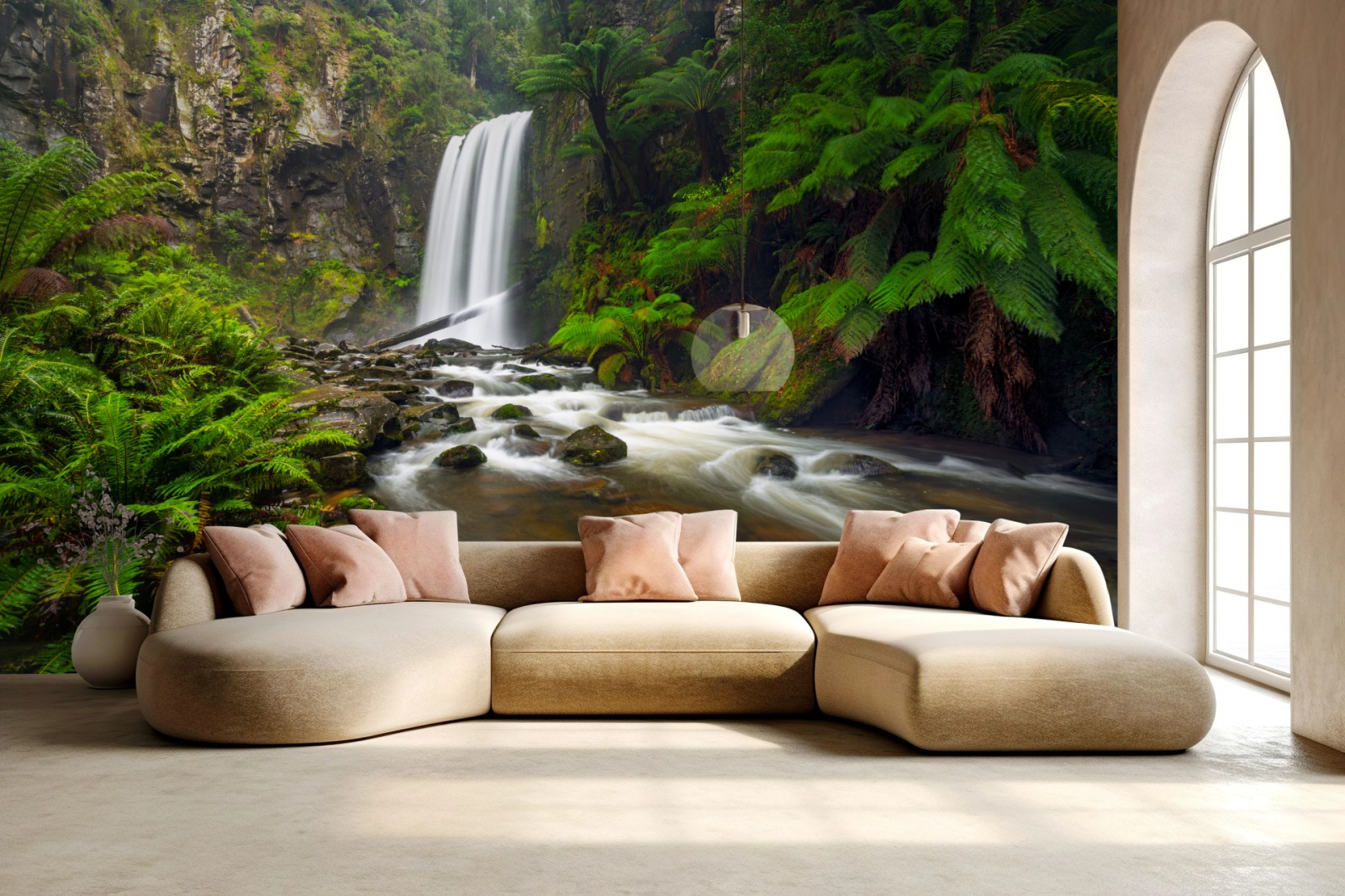 Fototapete Üppiger wasserfall im farnwald