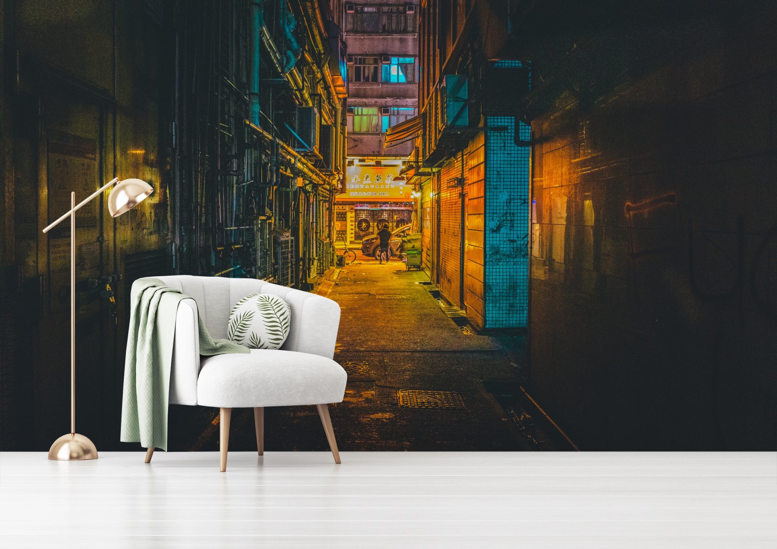 Stimmungsvolle Gasse in Hongkong, beleuchtet von Neonlichtern und perfekt, um urbanes Flair ins Zuhause zu bringen.MehrWeniger