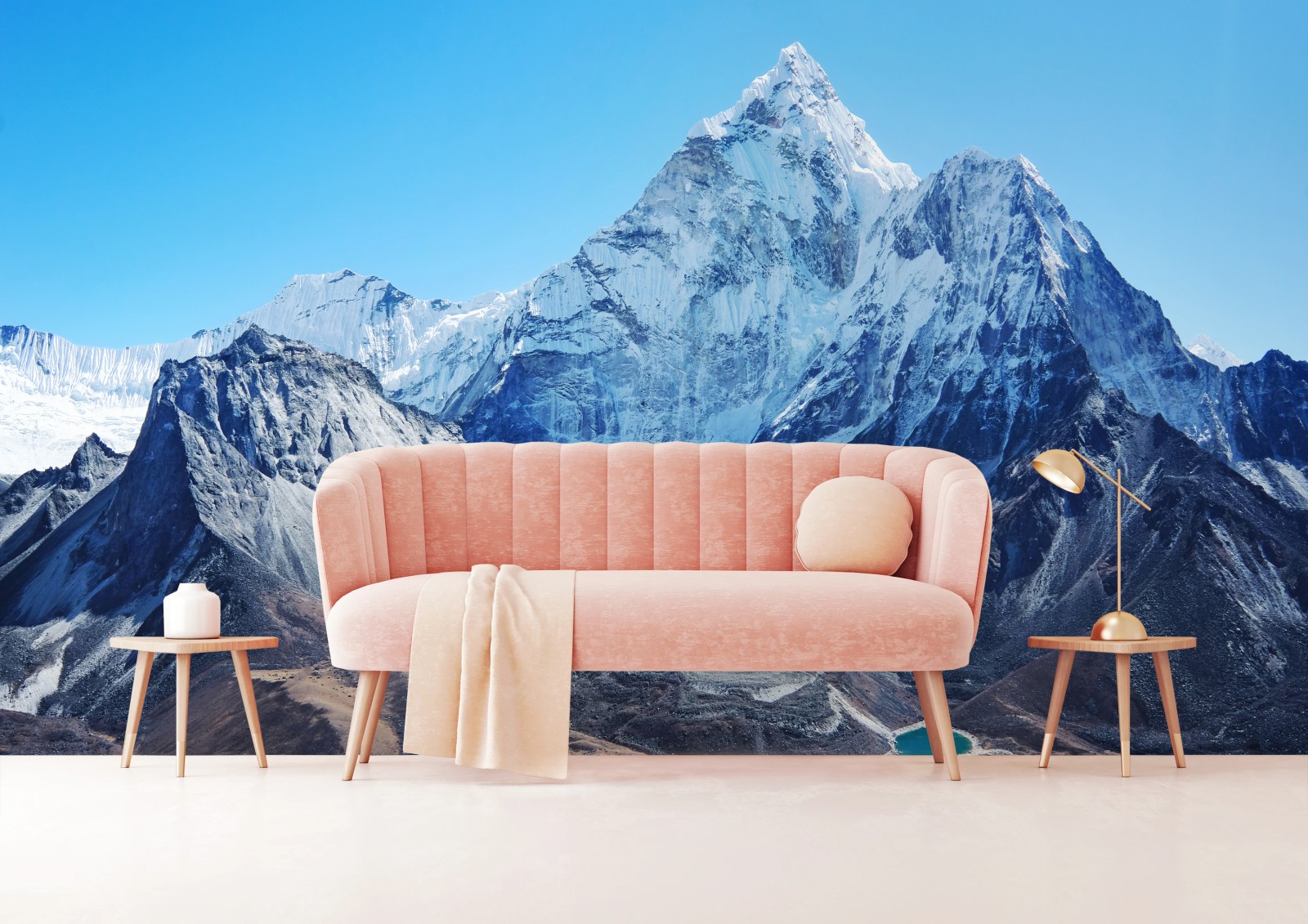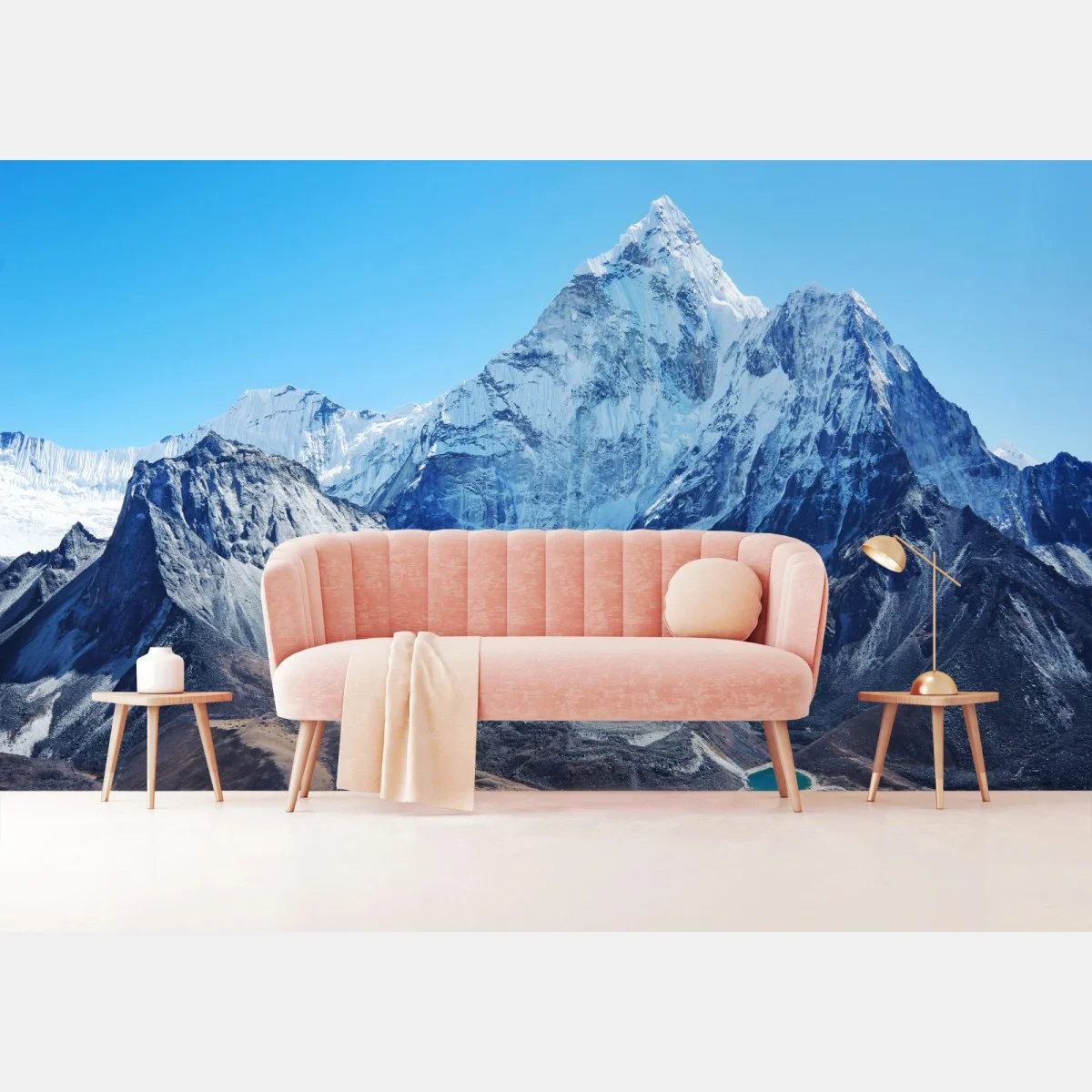 Eine beeindruckende Alpenlandschaft mit einem hohen schneebedeckten Gipfel, Gletschern und türkisfarbenen Seen, die jedem Raum natürliche Ruhe verleiht.MehrWeniger