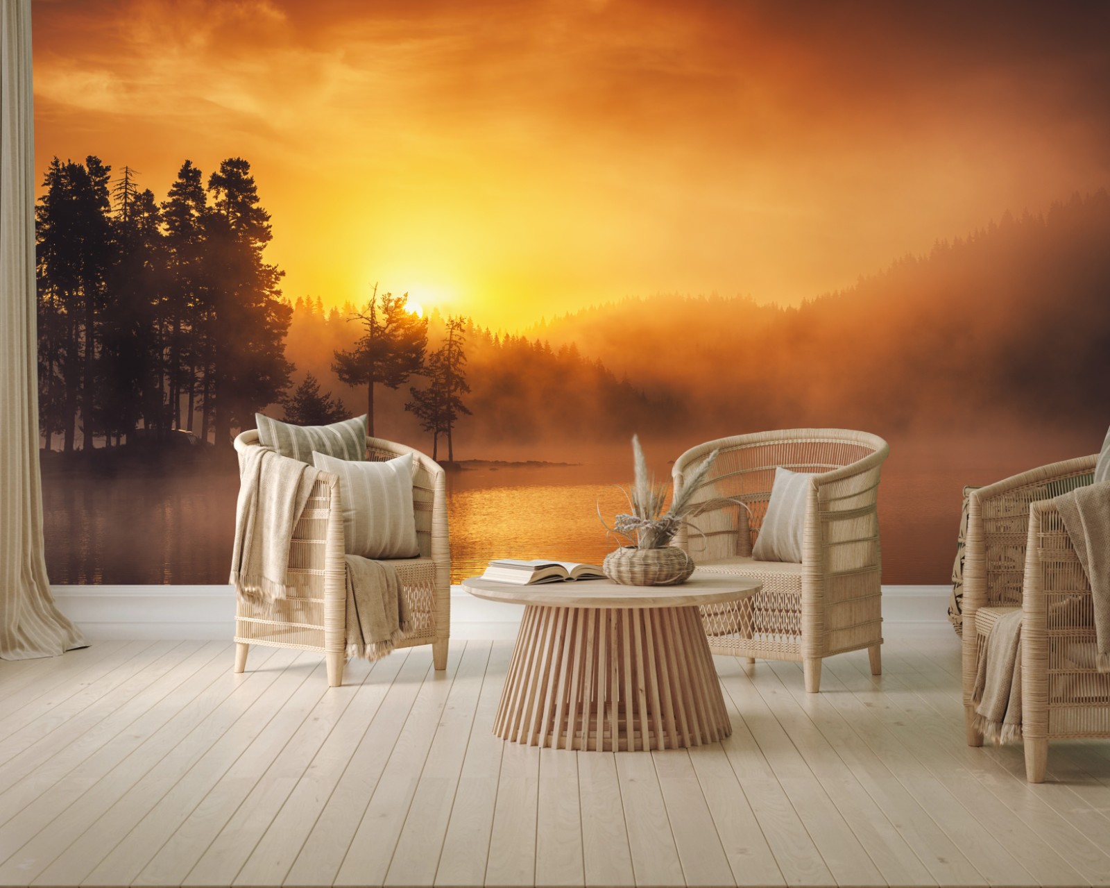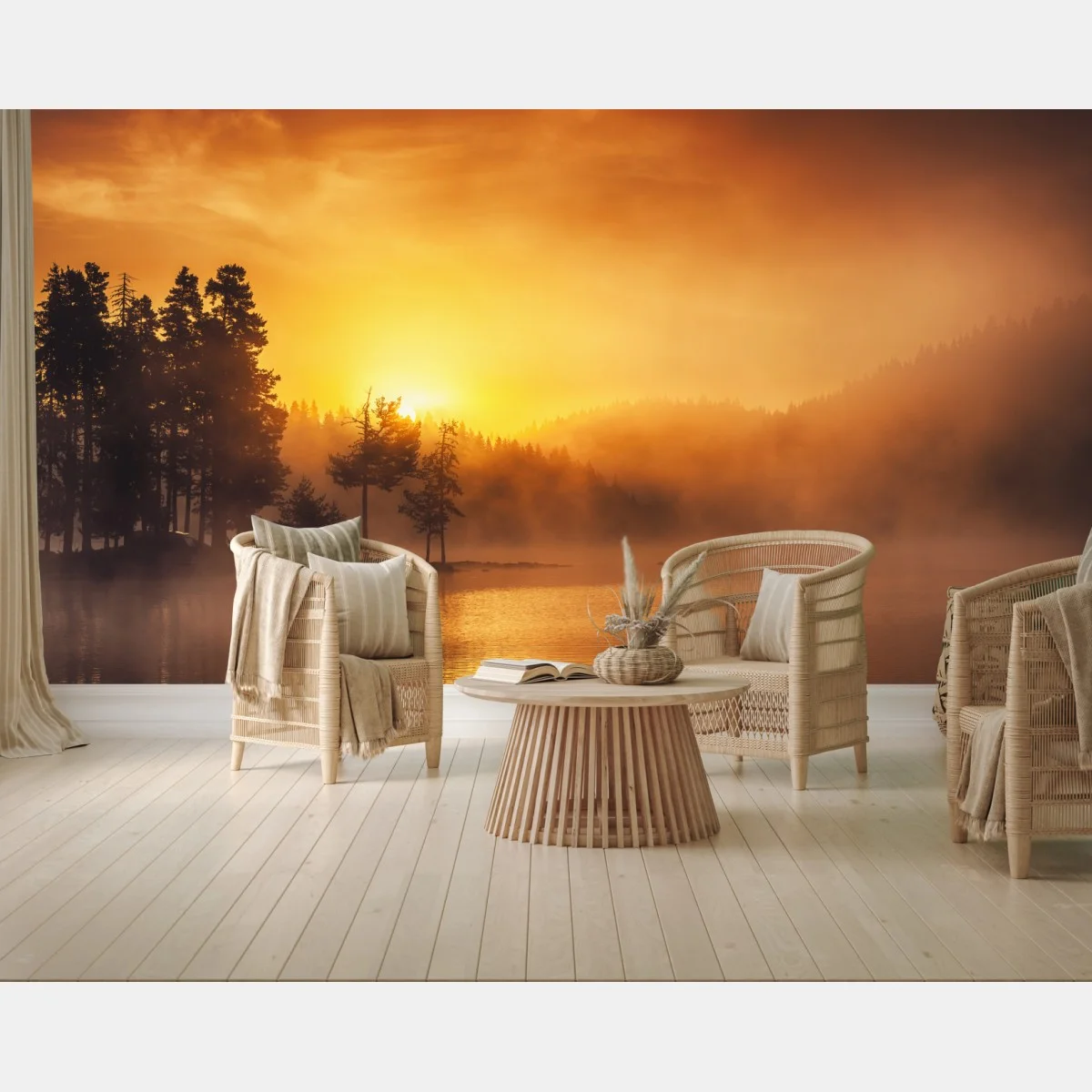 Fototapete Goldener sonnenaufgang über dem nebligen see
