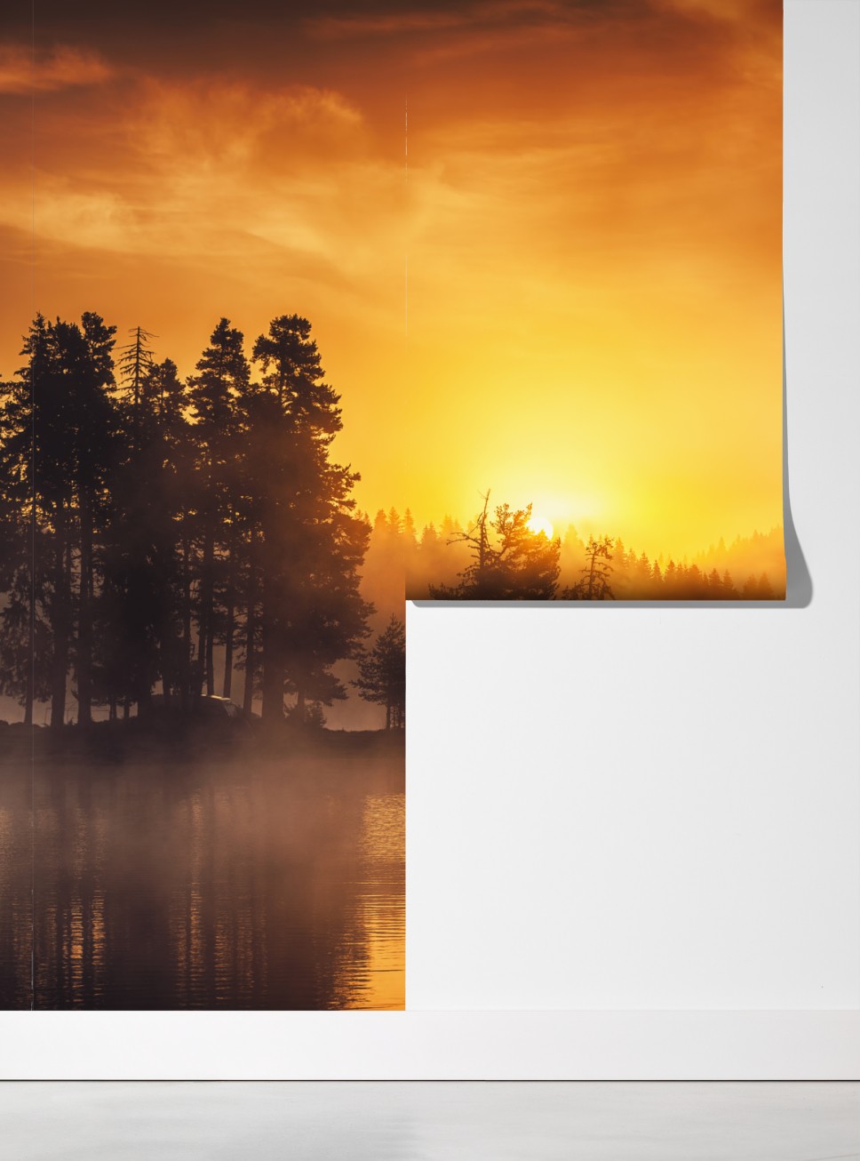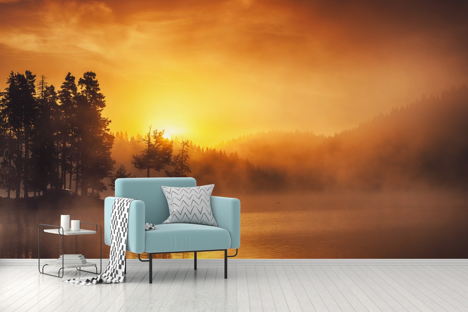 Ein friedlicher goldener Sonnenaufgang über einem nebligen See bringt Wärme und Ruhe in jeden Raum.