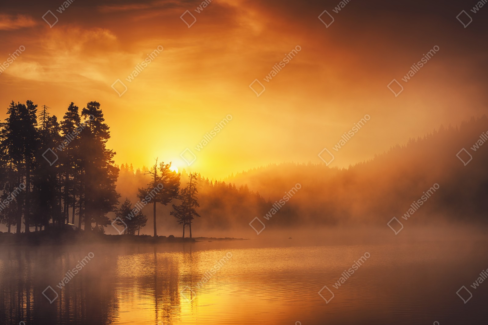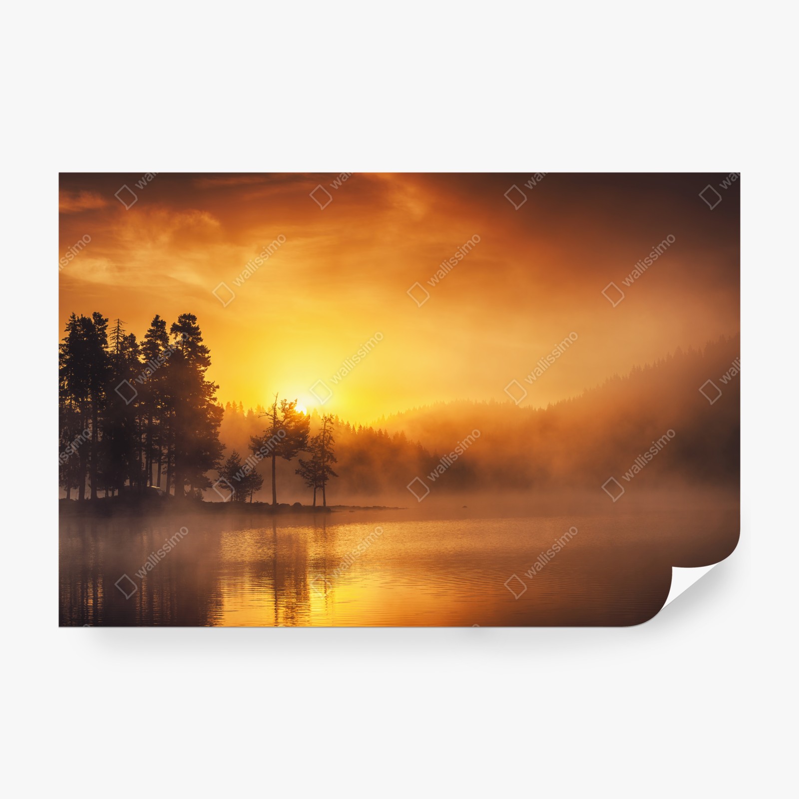 Fototapete goldener sonnenaufgang über dem nebligen see