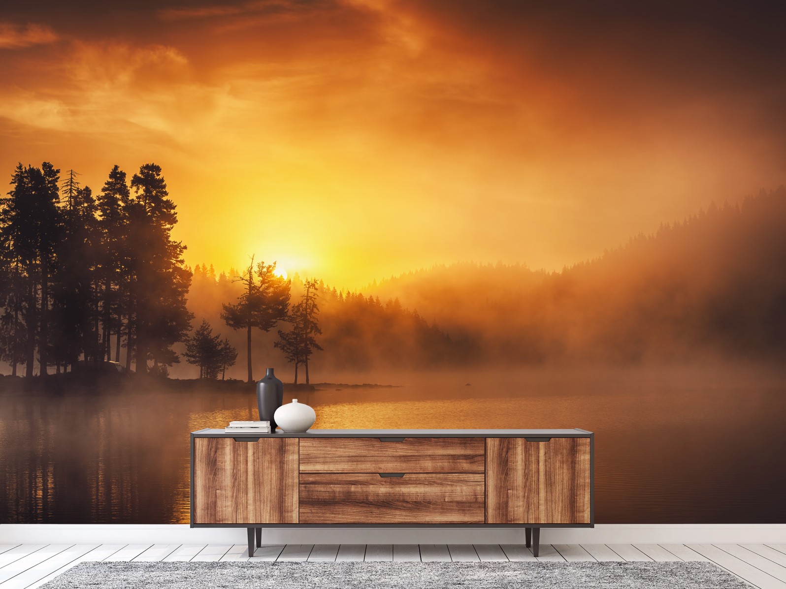 Fototapete Goldener sonnenaufgang über dem nebligen see