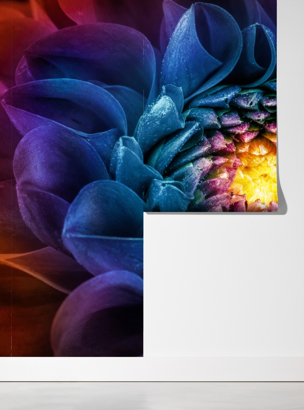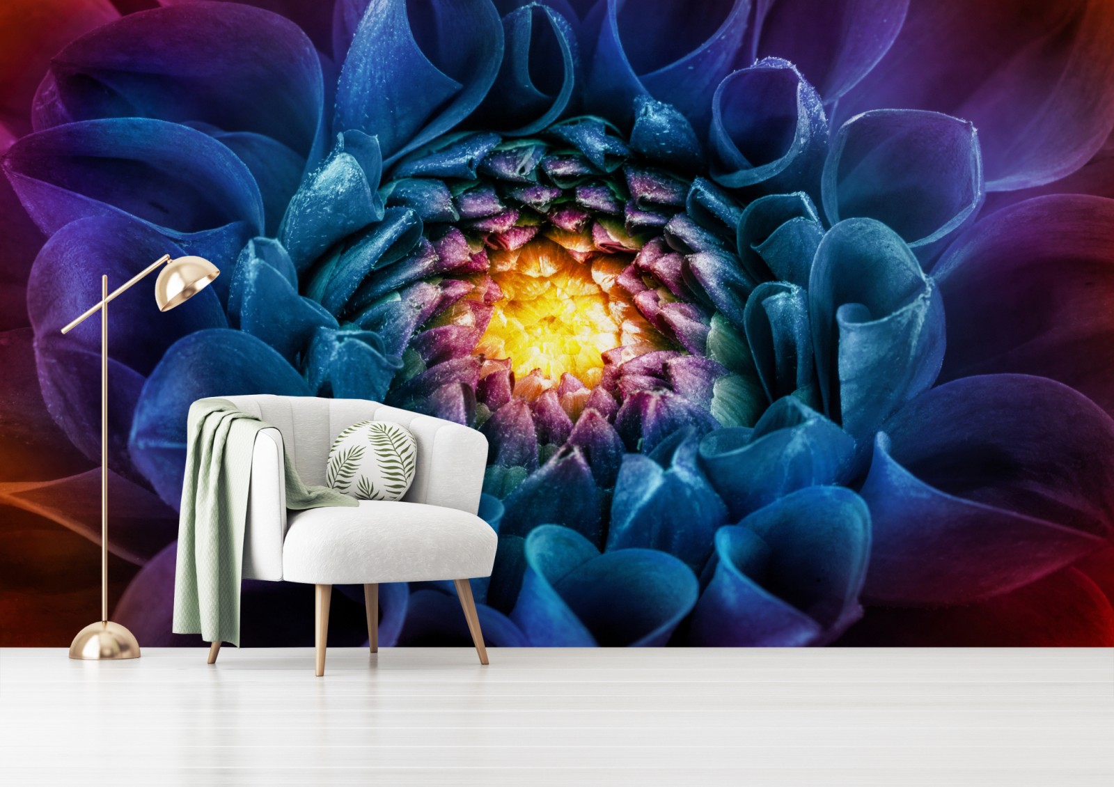 Beeindruckende Makroaufnahme einer bunten Chrysantheme mit tiefen Blautönen und strahlendem Gelb, ideal zur Belebung von Wohnräumen.