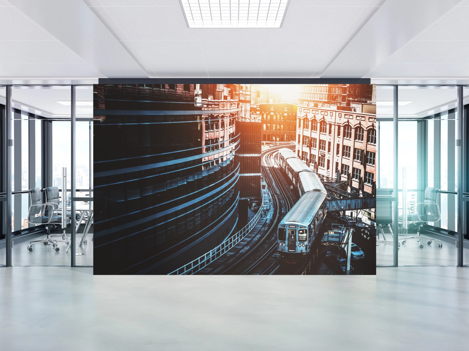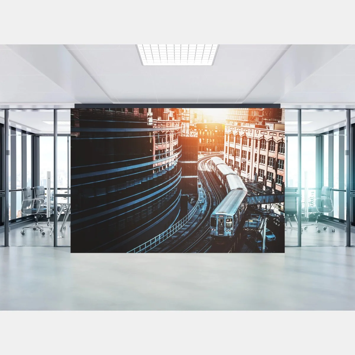 Dynamisches Stadtbild mit einer Hochbahn, die sich im goldenen Licht durch die Innenstadt von Chicago schlängelt, ideal für industrielle und moderne Wohnräume.MehrWeniger