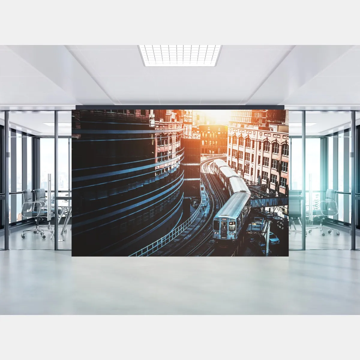Dynamisches Stadtbild mit einer Hochbahn, die sich im goldenen Licht durch die Innenstadt von Chicago schlängelt, ideal für industrielle und moderne Wohnräume.