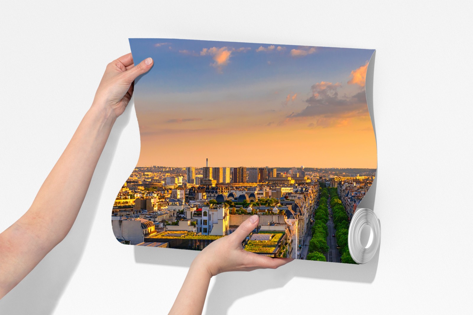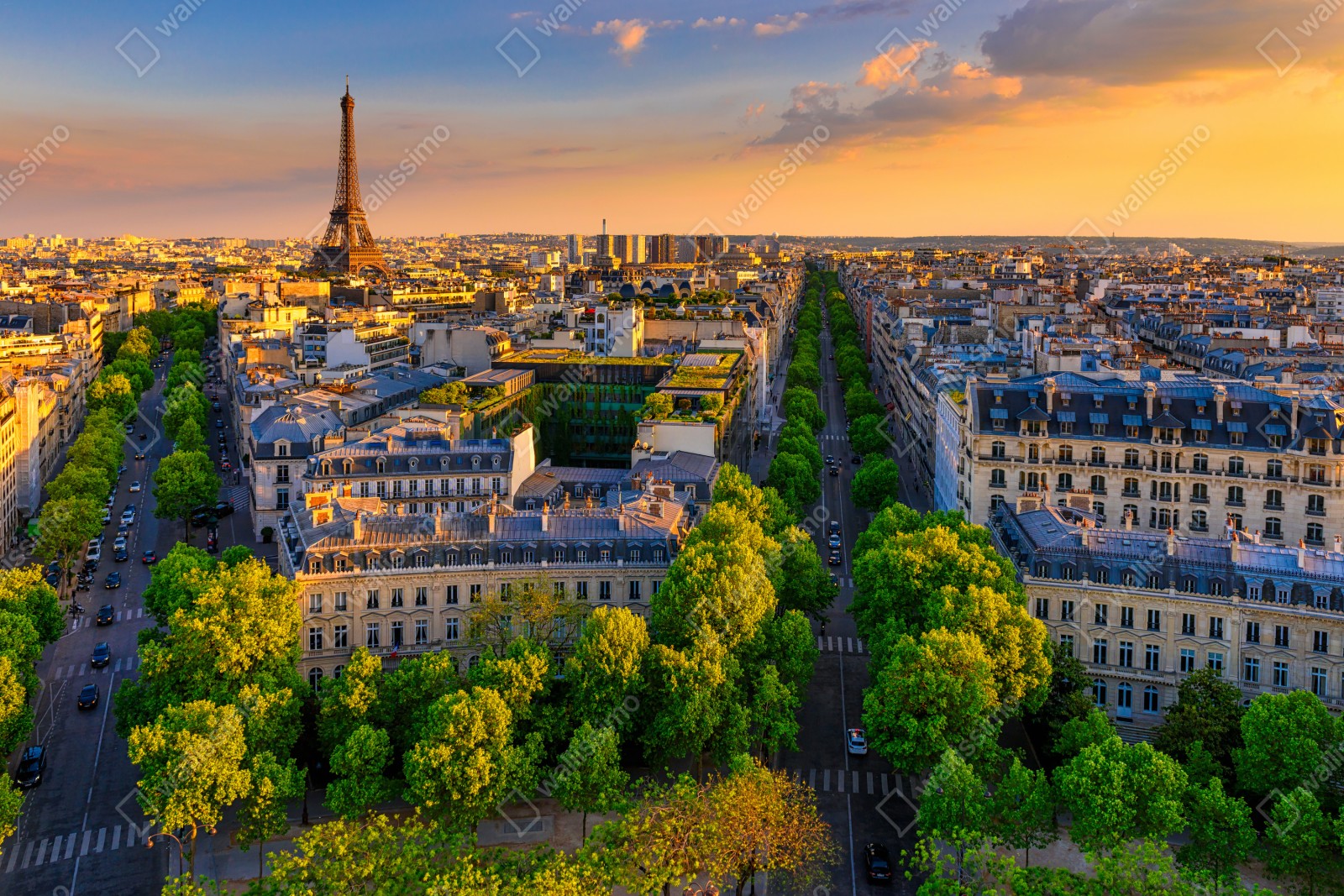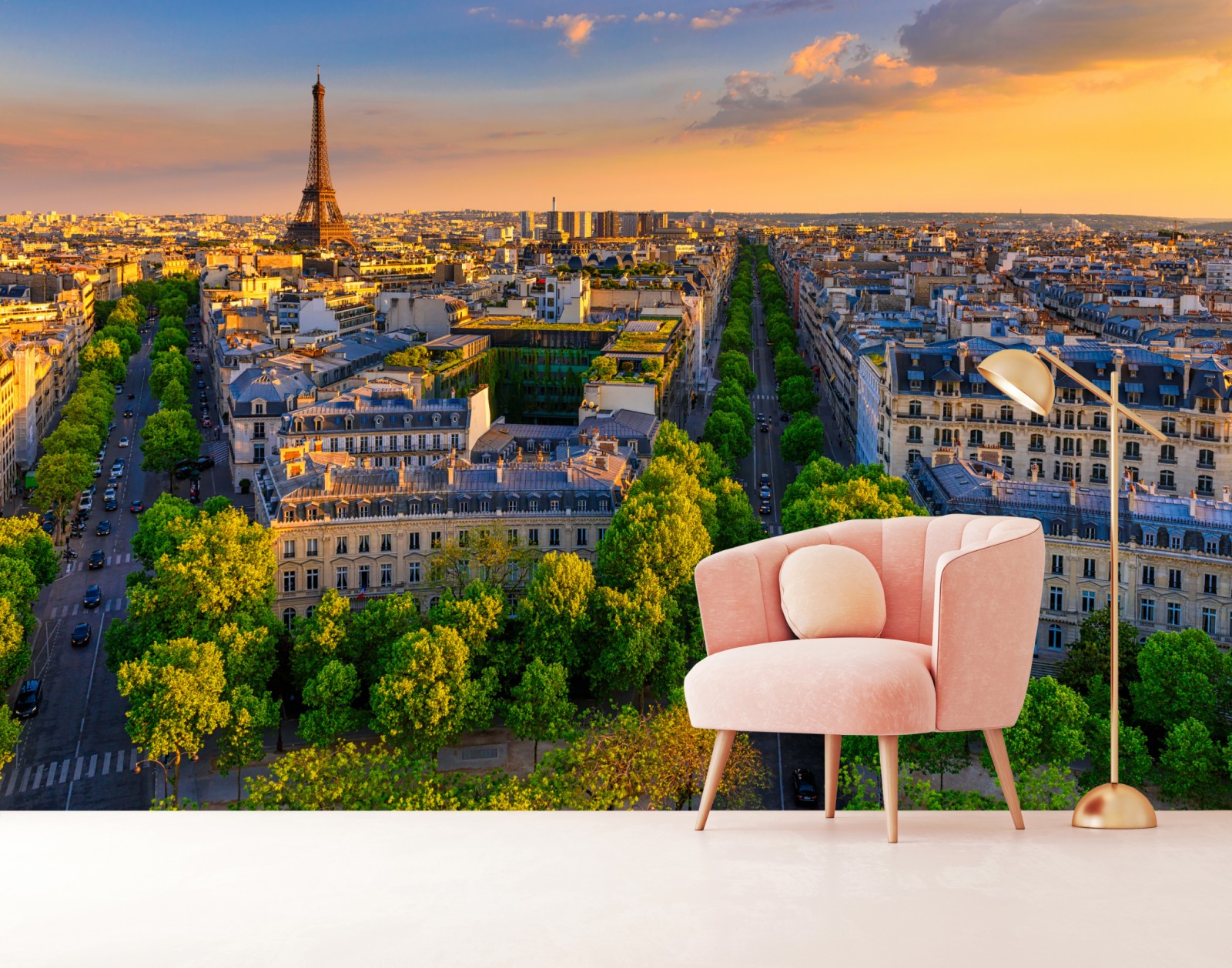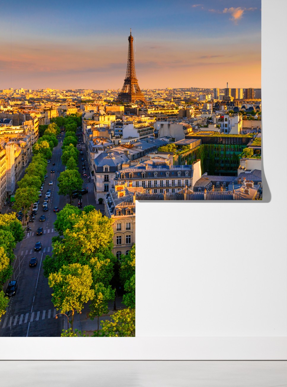Lebhafte Panoramaaufnahme von Paris bei Sonnenuntergang mit dem Eiffelturm und baumgesäumten Alleen, perfekt, um Räumen urbane Eleganz zu verleihen.