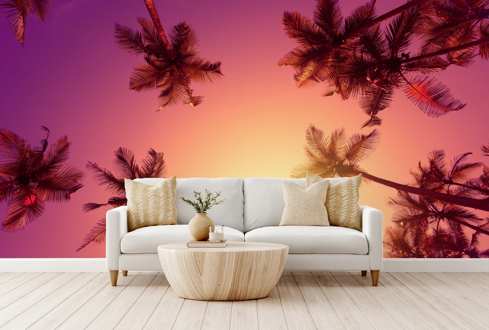 Fototapete Tropischer sonnenuntergang mit palmen-silhouetten