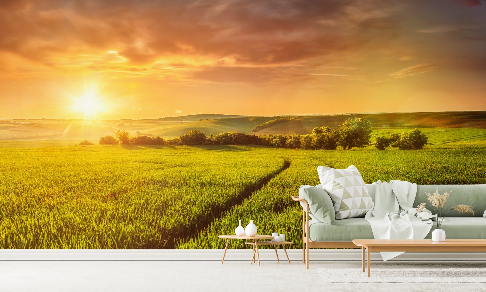 Fototapete Sonnenbeschienene wiese im abendlicht