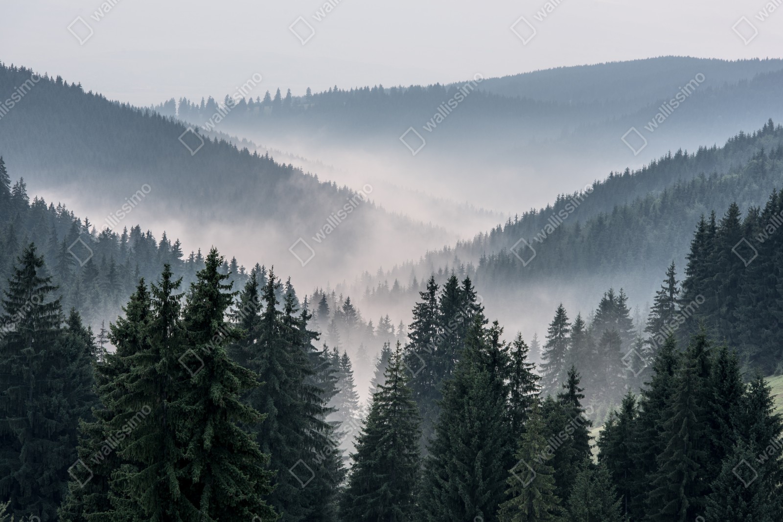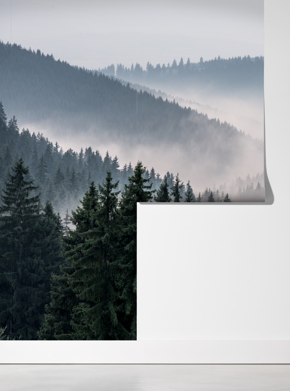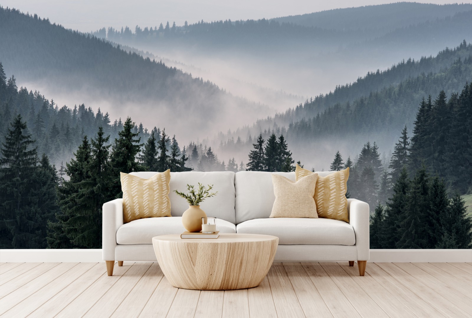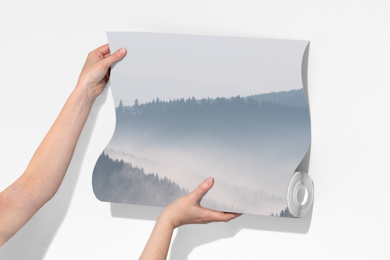 Eine ruhige, nebelverhangene Bergwaldszene die natürliche Schönheit und entspannte Atmosphäre an jede Wand bringt.