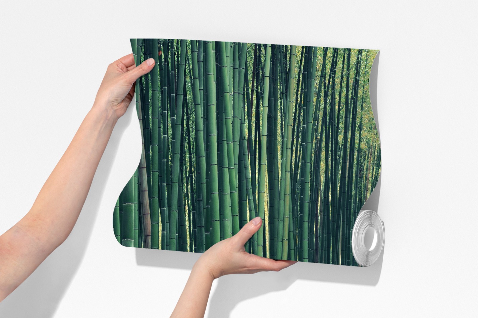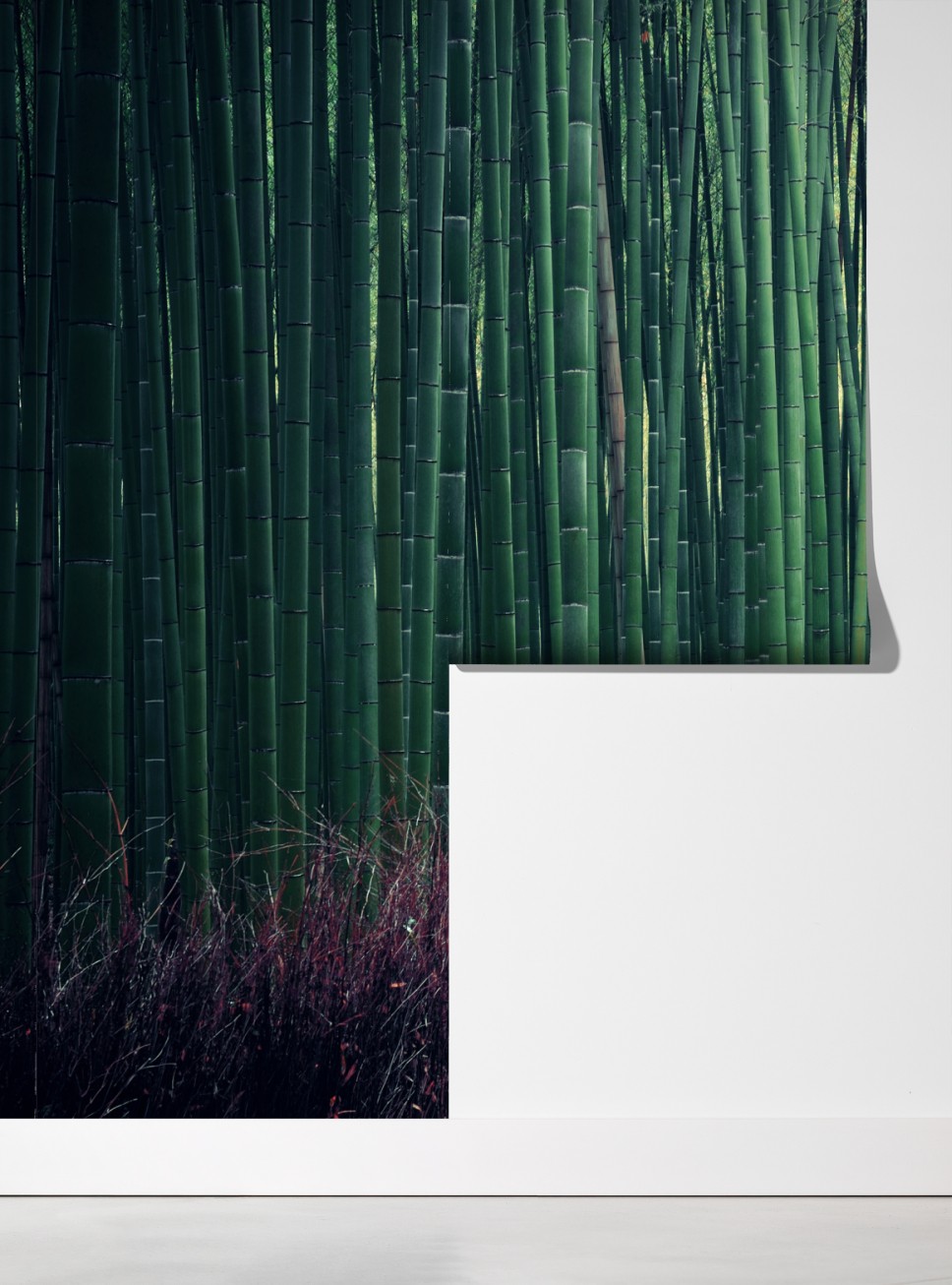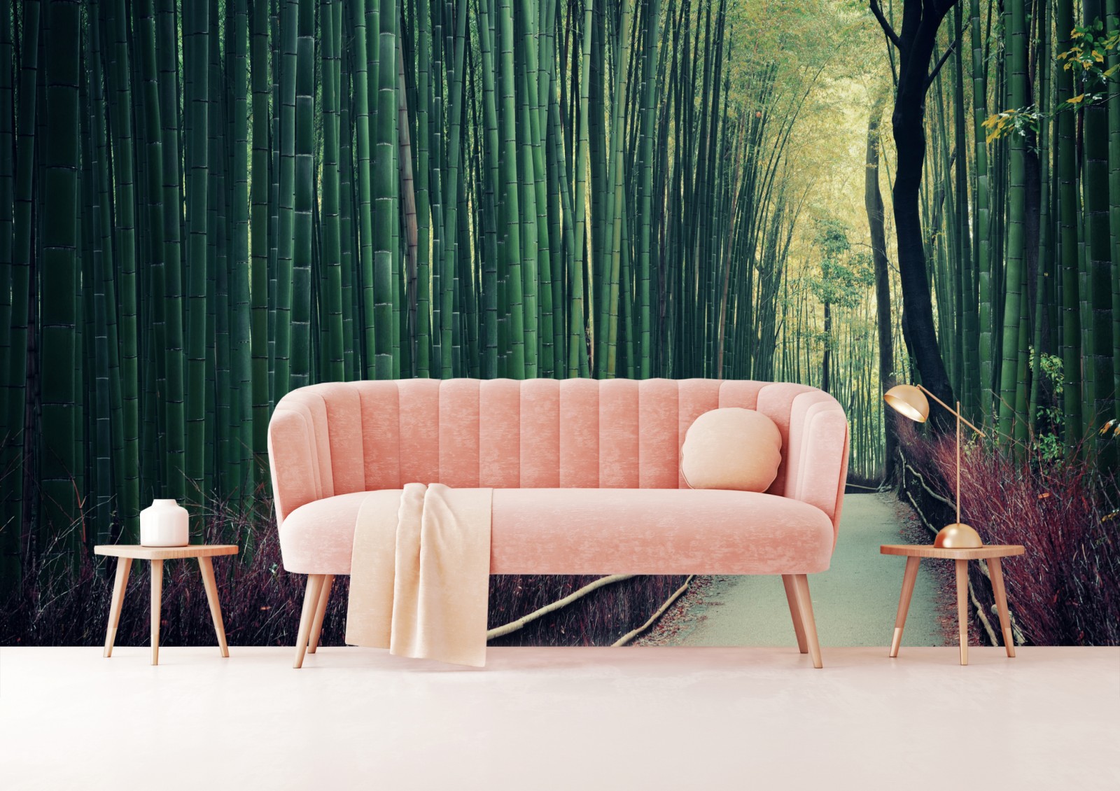 Bringen Sie die beruhigende Atmosphäre eines japanischen Bambuswaldes in Ihren Raum mit diesem Blick auf einen Pfad in Arashiyama, Kyoto.