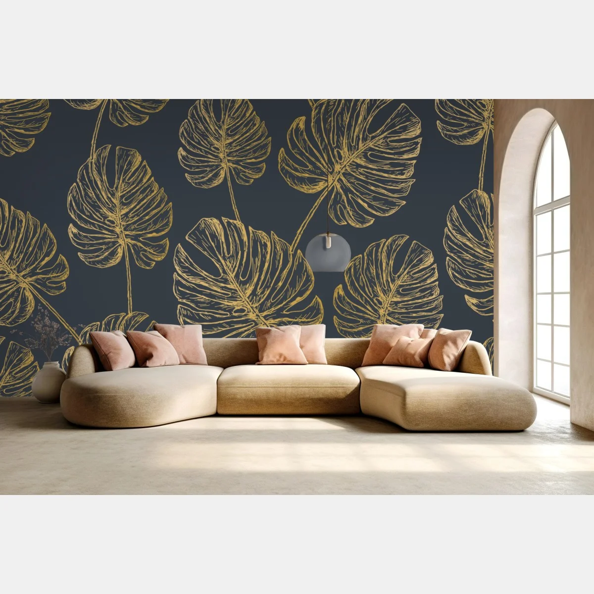 Fototapete Goldene monstera-blätter auf dunklem hintergrund