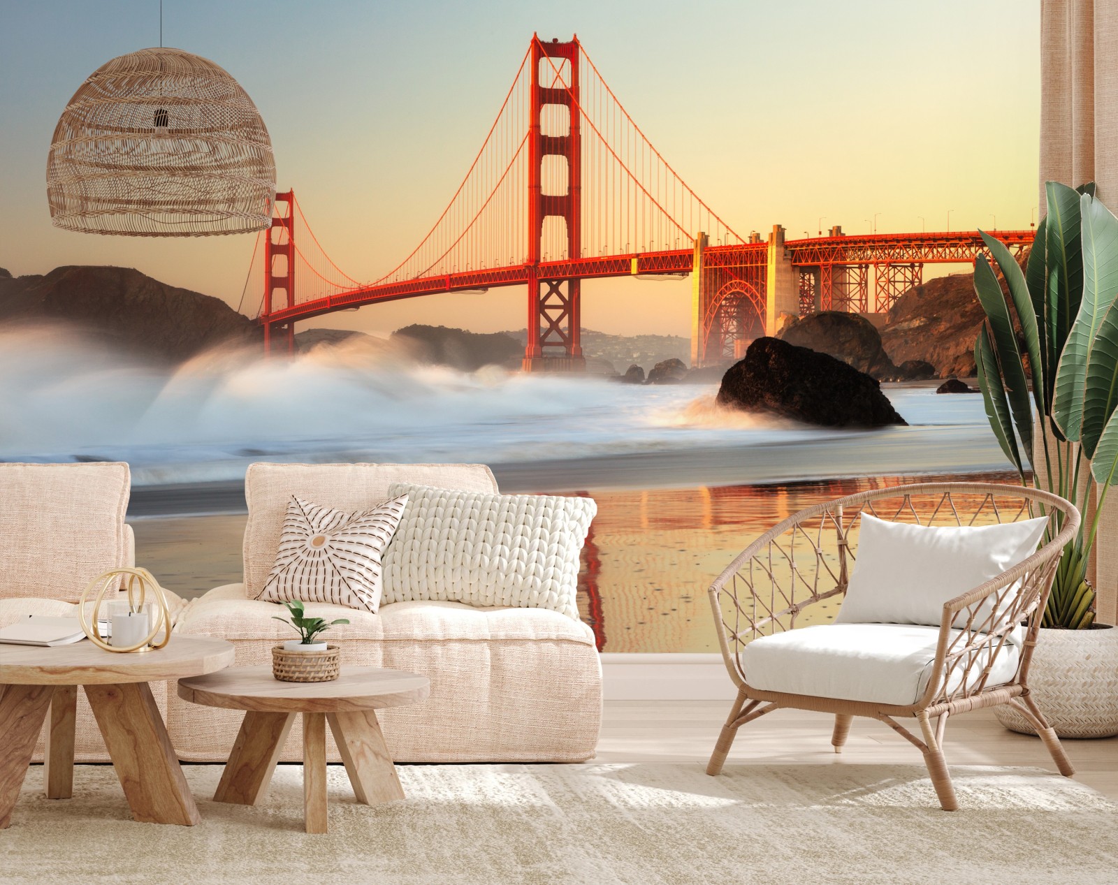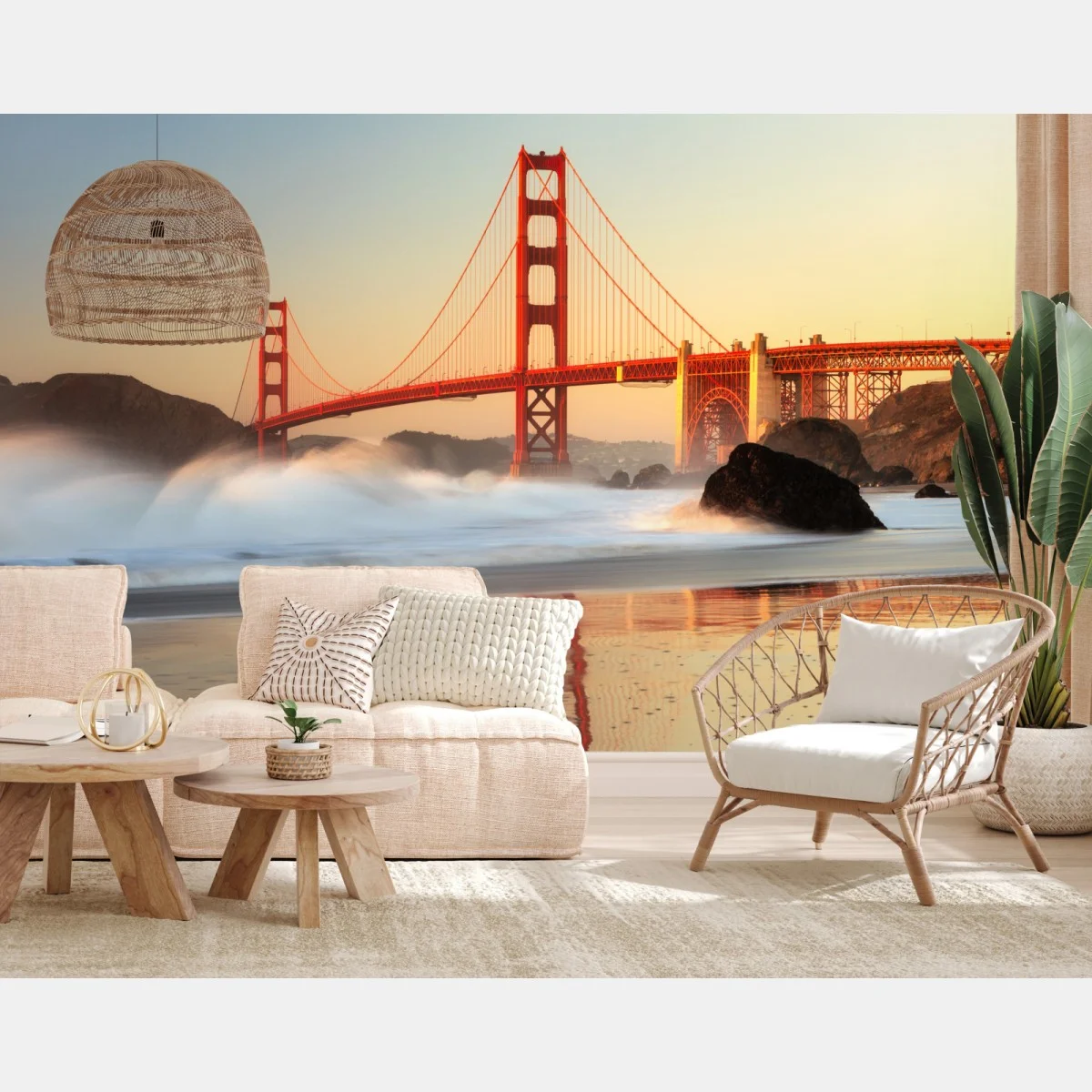 Dramatische Ansicht der Golden Gate brücke bei Sonnenuntergang mit Spiegelung im nassen Sand, ideal um Räumen Wärme und Reiselust zu verleihen.MehrWeniger