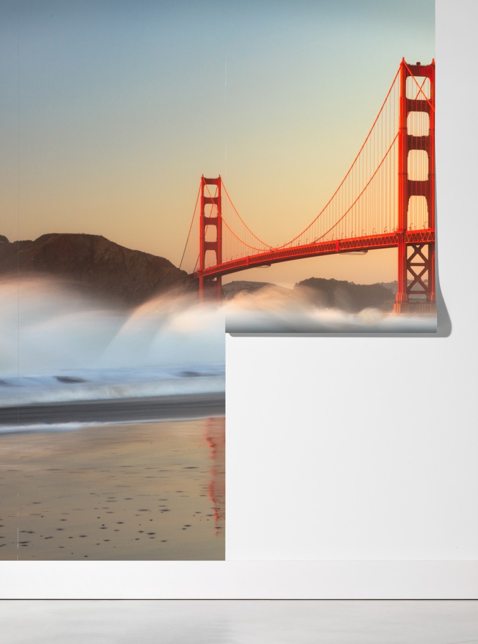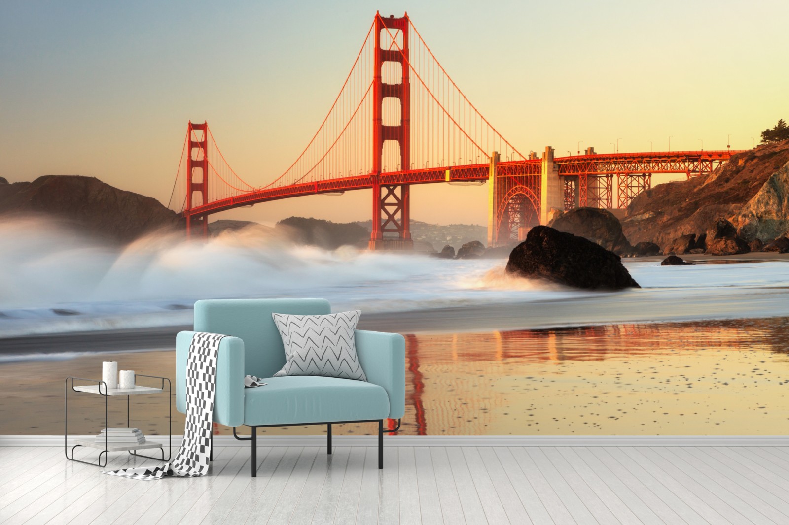 Dramatische Ansicht der Golden Gate brücke bei Sonnenuntergang mit Spiegelung im nassen Sand, ideal um Räumen Wärme und Reiselust zu verleihen.