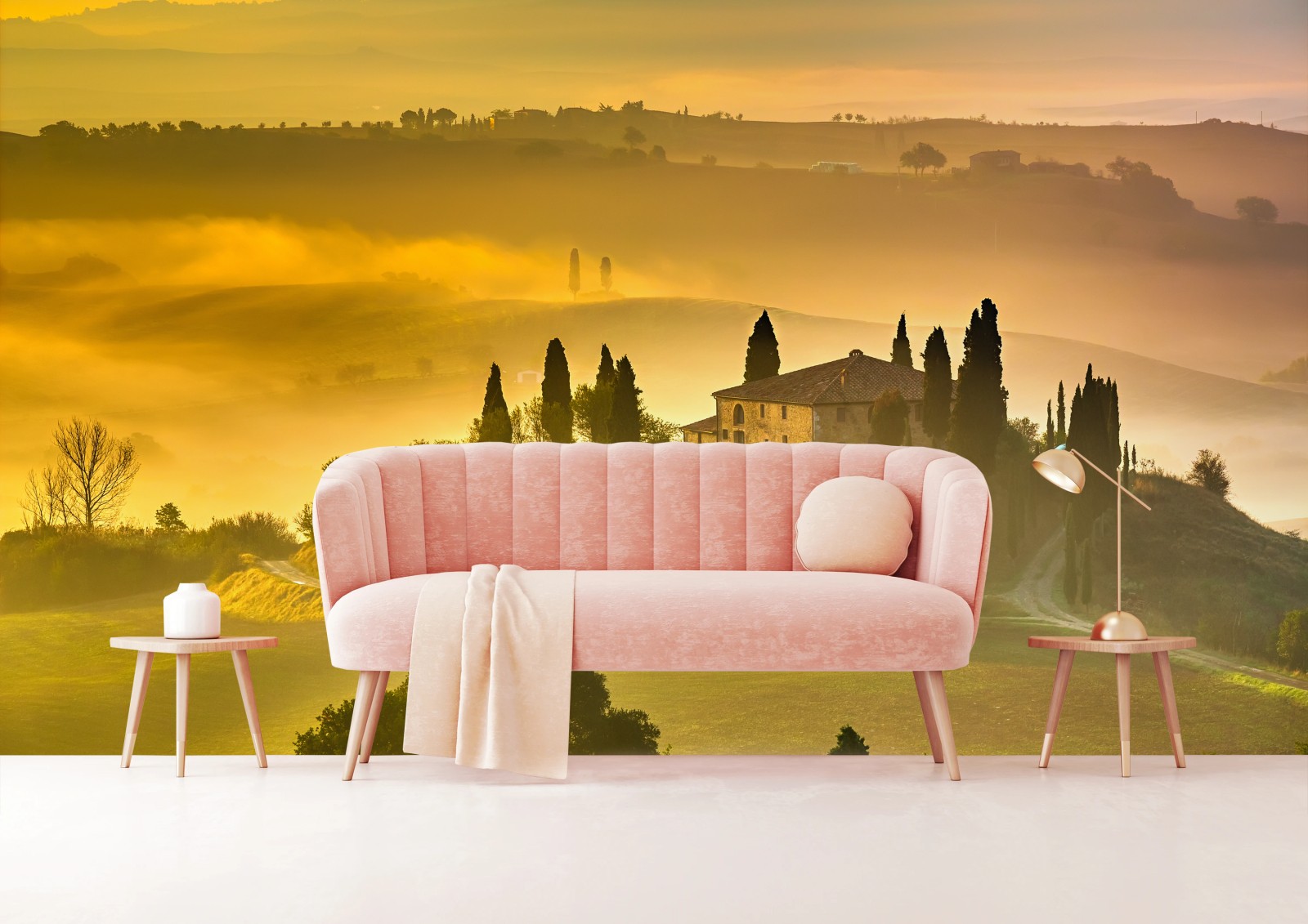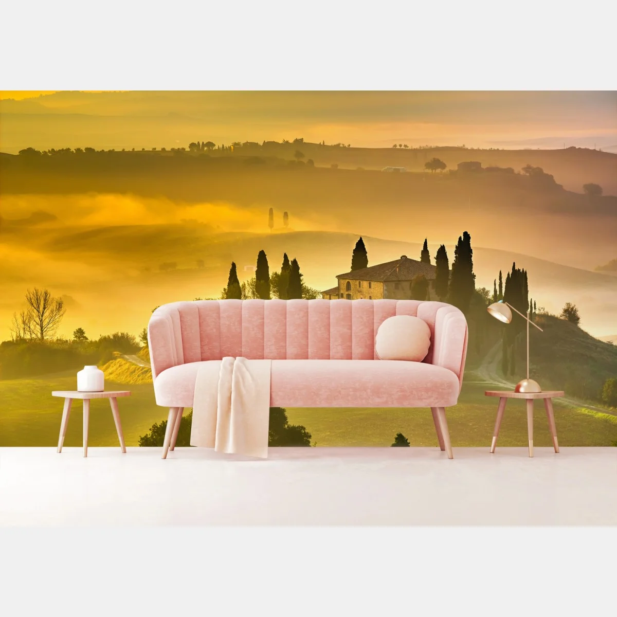 Fototapete Toskana bei sonnenaufgang über goldenen hügeln