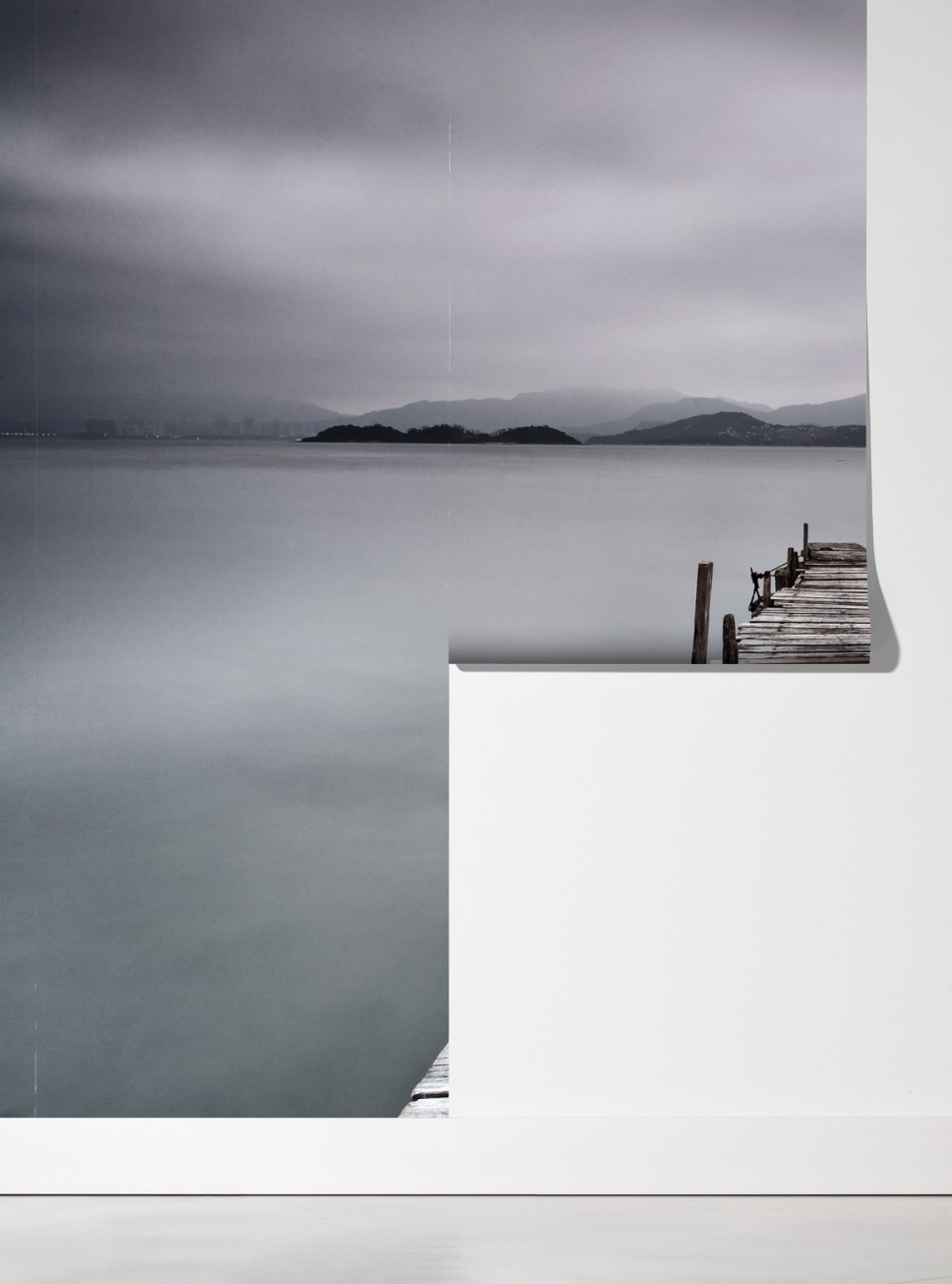 Ein ruhiges Langzeitbelichtungs-Meeresbild mit einer verwitterten Holzseebrücke und festgemachten Booten in gedämpften Grautönen, perfekt um Ihrem Raum Ruhe zu verleihen.