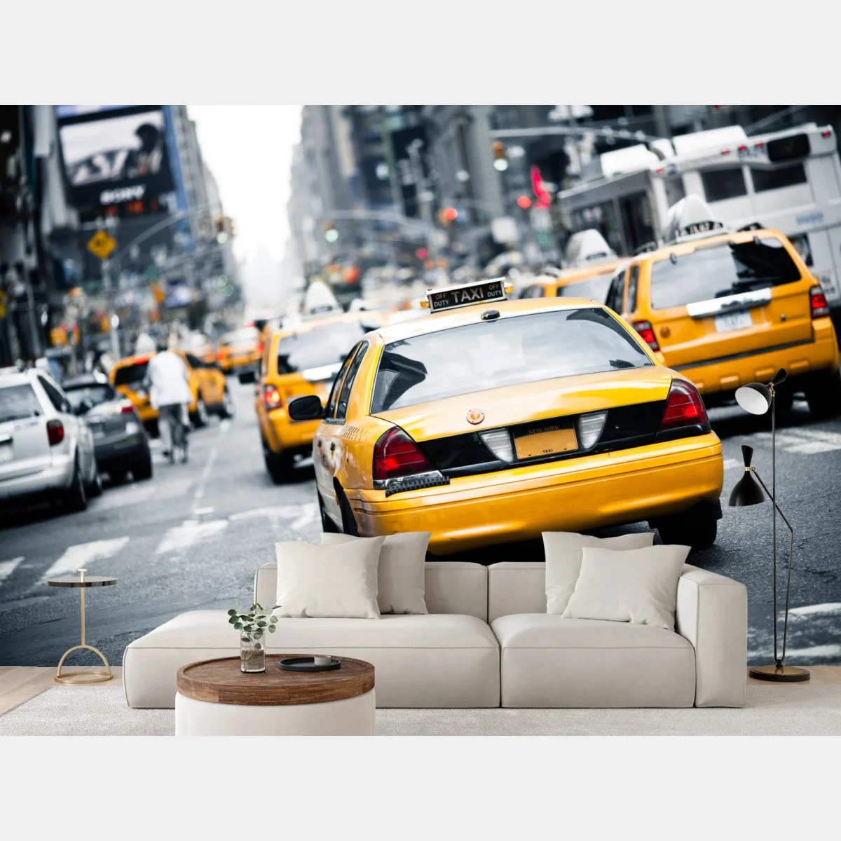 Dynamisches Stadtfoto mit ikonischen gelben Taxis im Herzen von New York, ideal um urbanes Flair an die Wand zu bringen.MehrWeniger