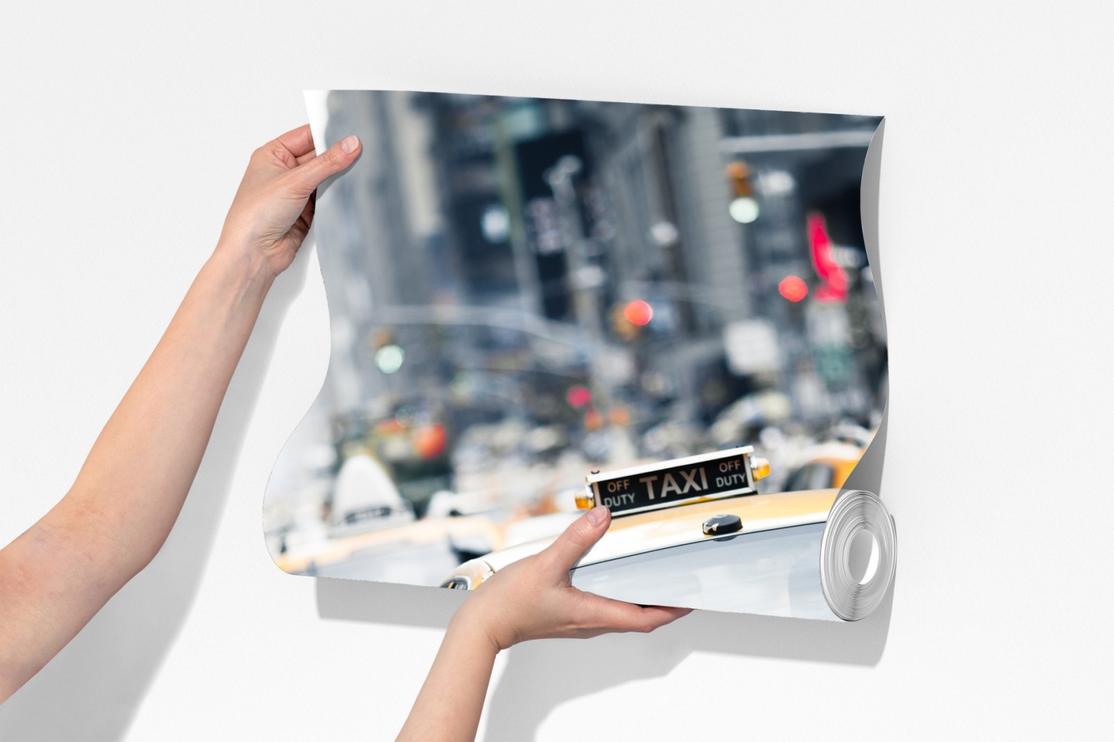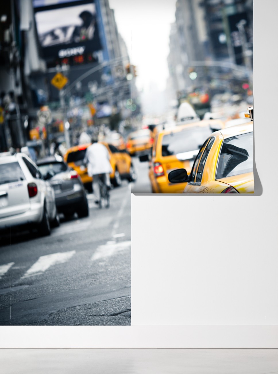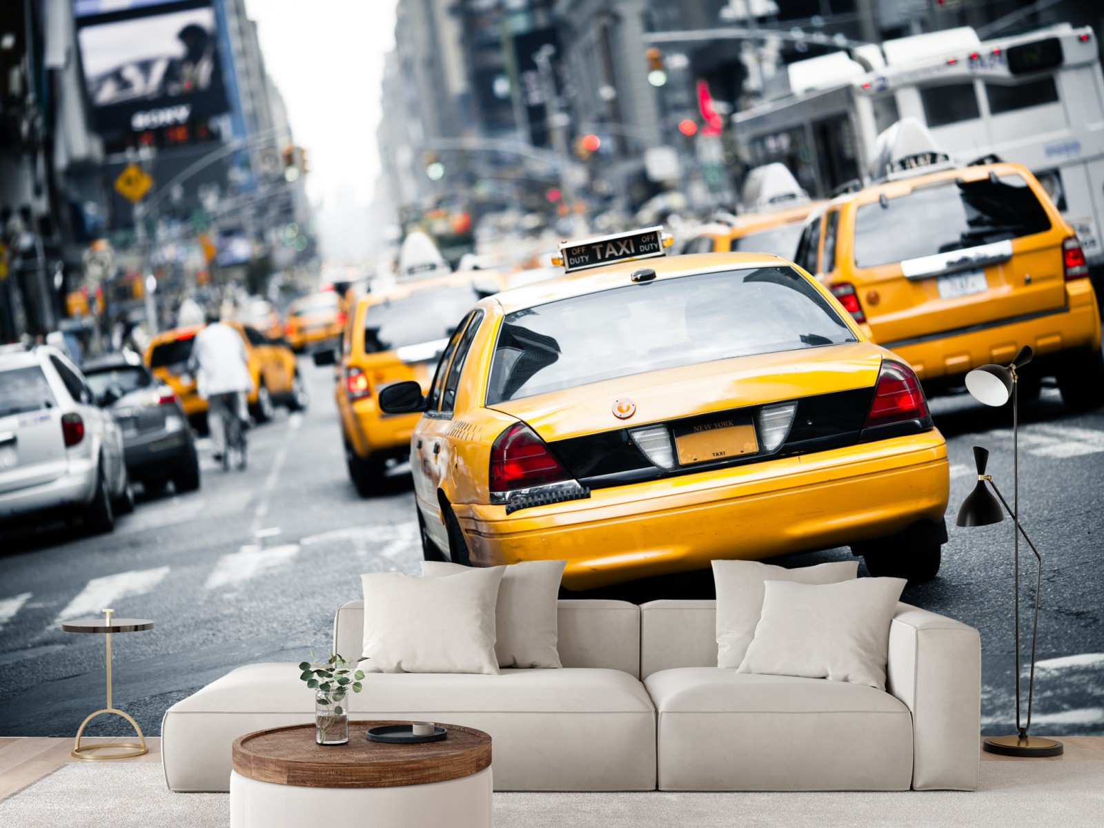 Dynamisches Stadtfoto mit ikonischen gelben Taxis im Herzen von New York, ideal um urbanes Flair an die Wand zu bringen.