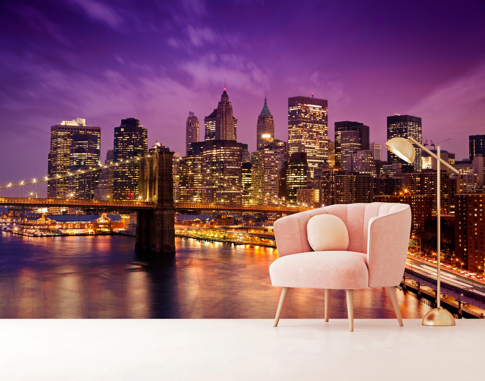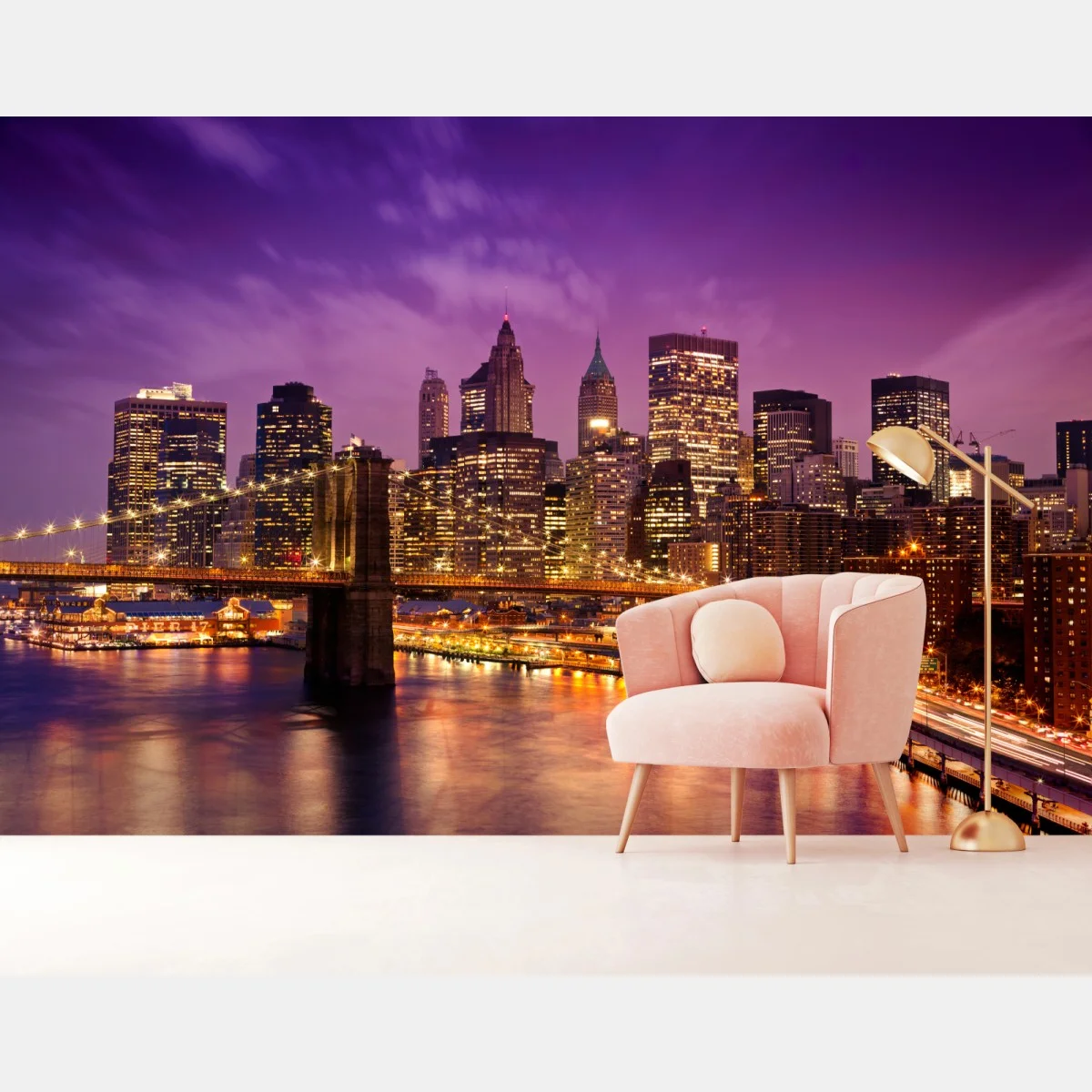 Fototapete Violette skyline über leuchtender stadt und brücke