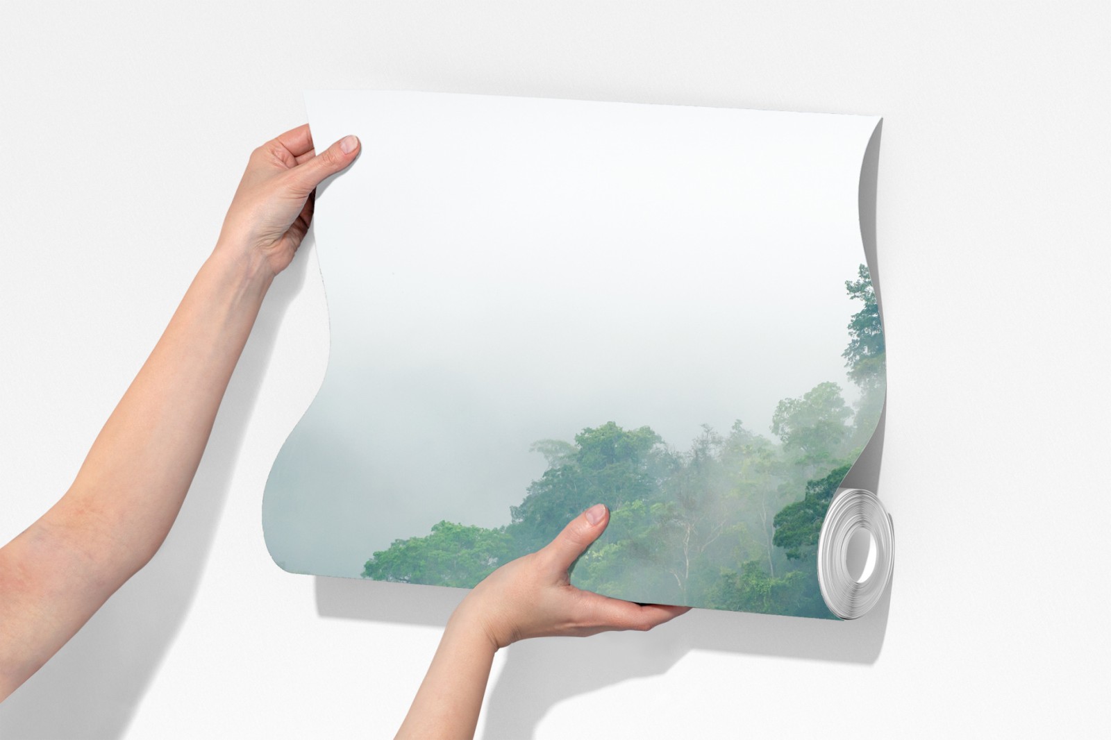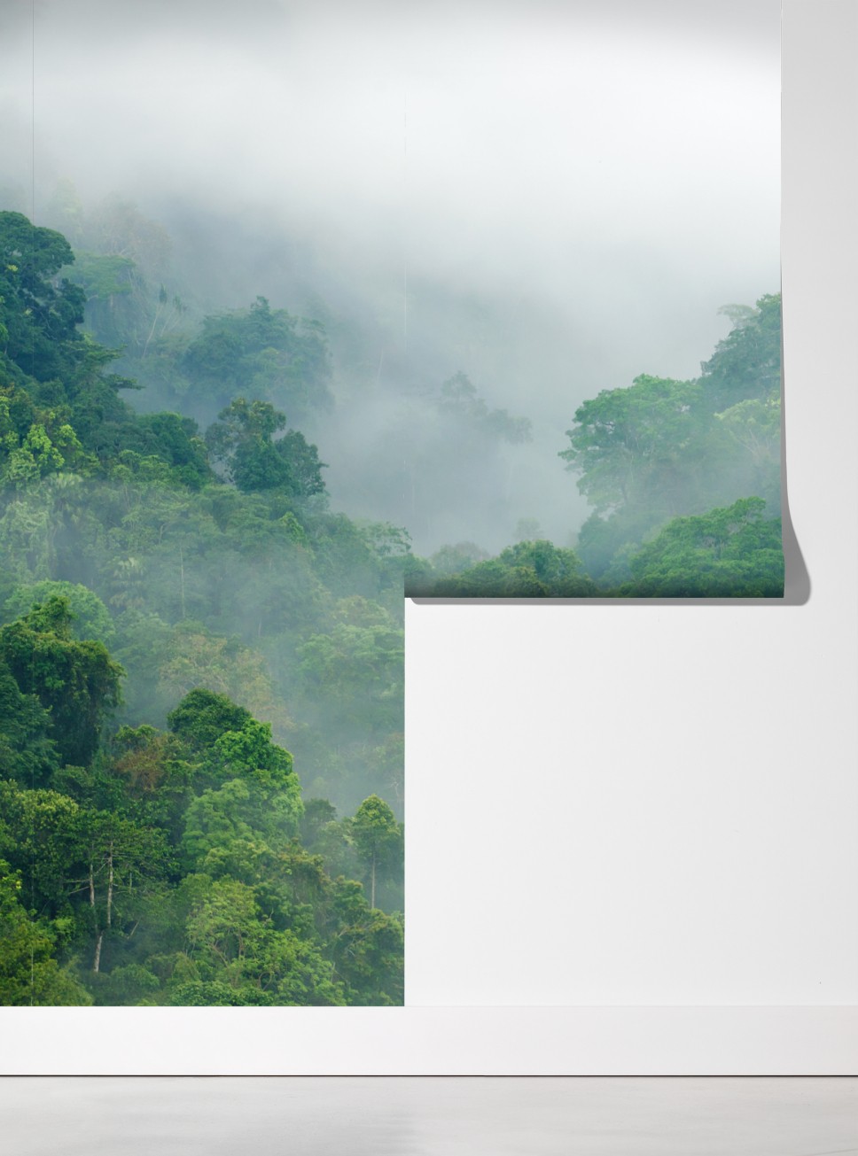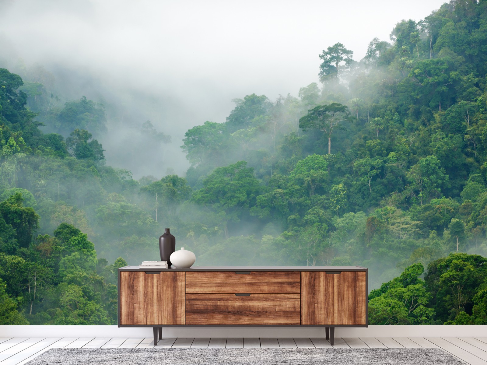 Ein beruhigendes Foto von morgendlichem Nebel, der durch den üppigen Kaeng Krachan Regenwald zieht und ruhige grüne Töne sowie natürliche Struktur an Ihre Wand bringt.