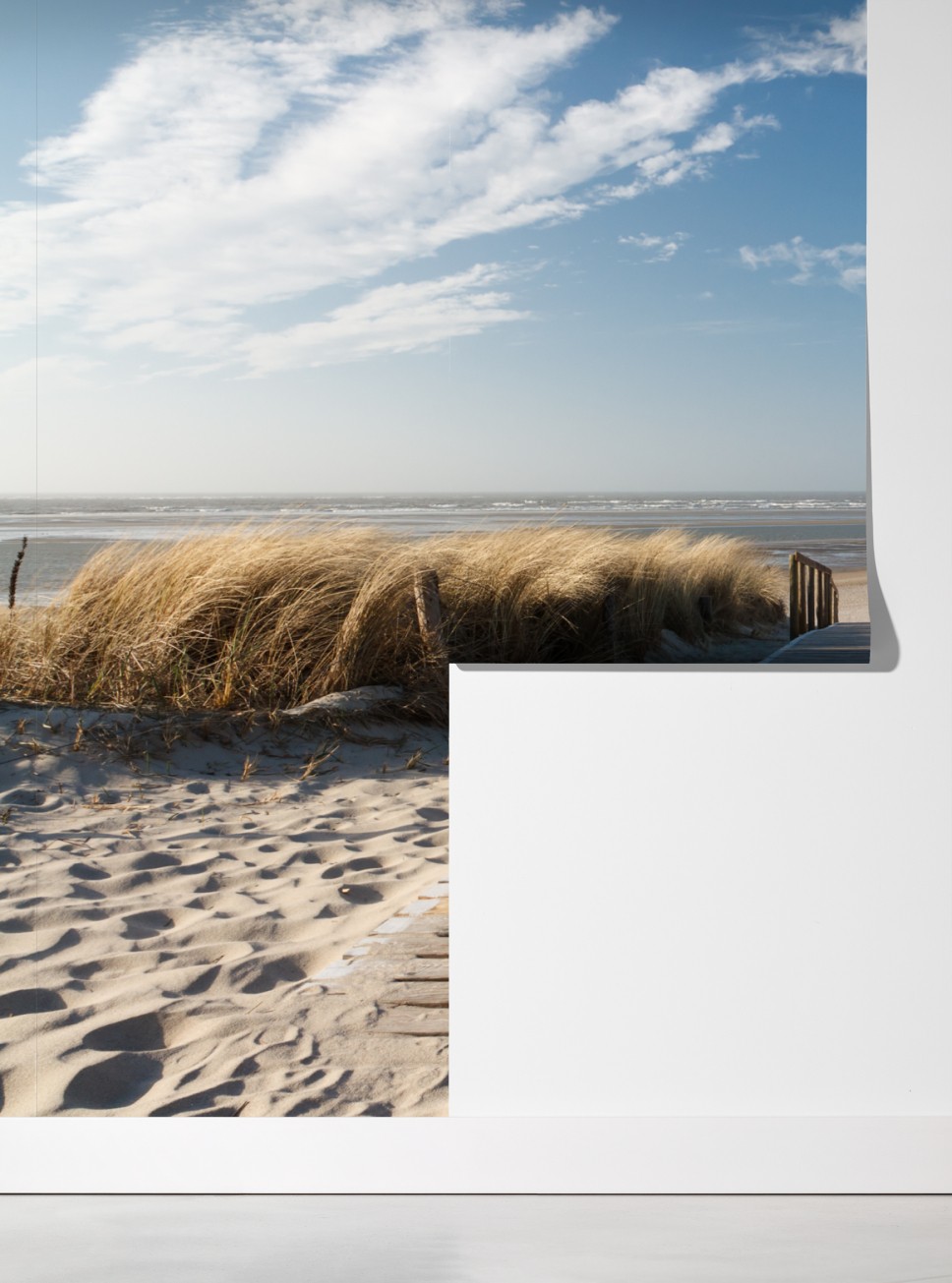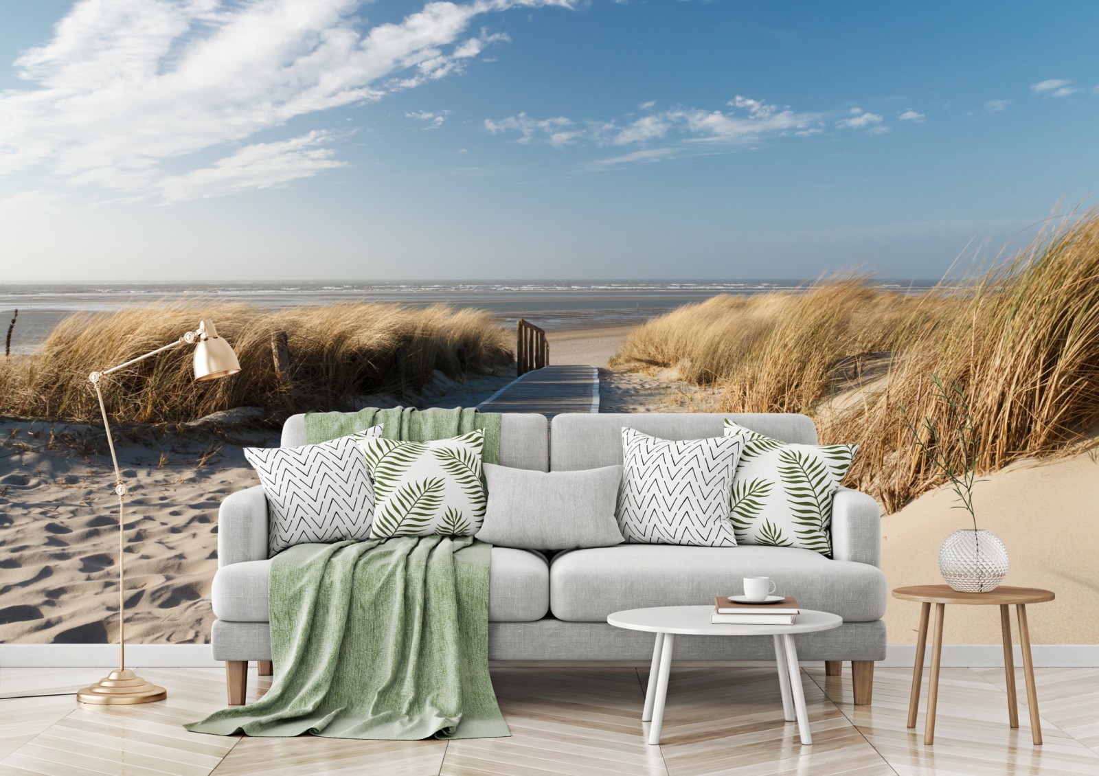 Ruhige Küstenszene mit einem hölzernen Steg durch Dünen zum Meer, ideal um ein luftiges und entspannendes Raumambiente zu schaffen.