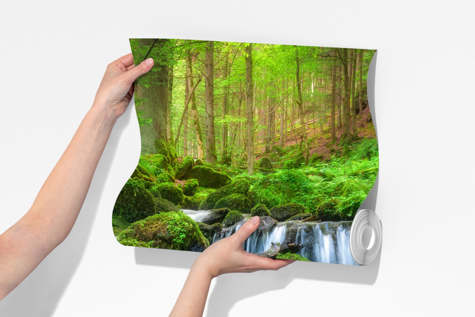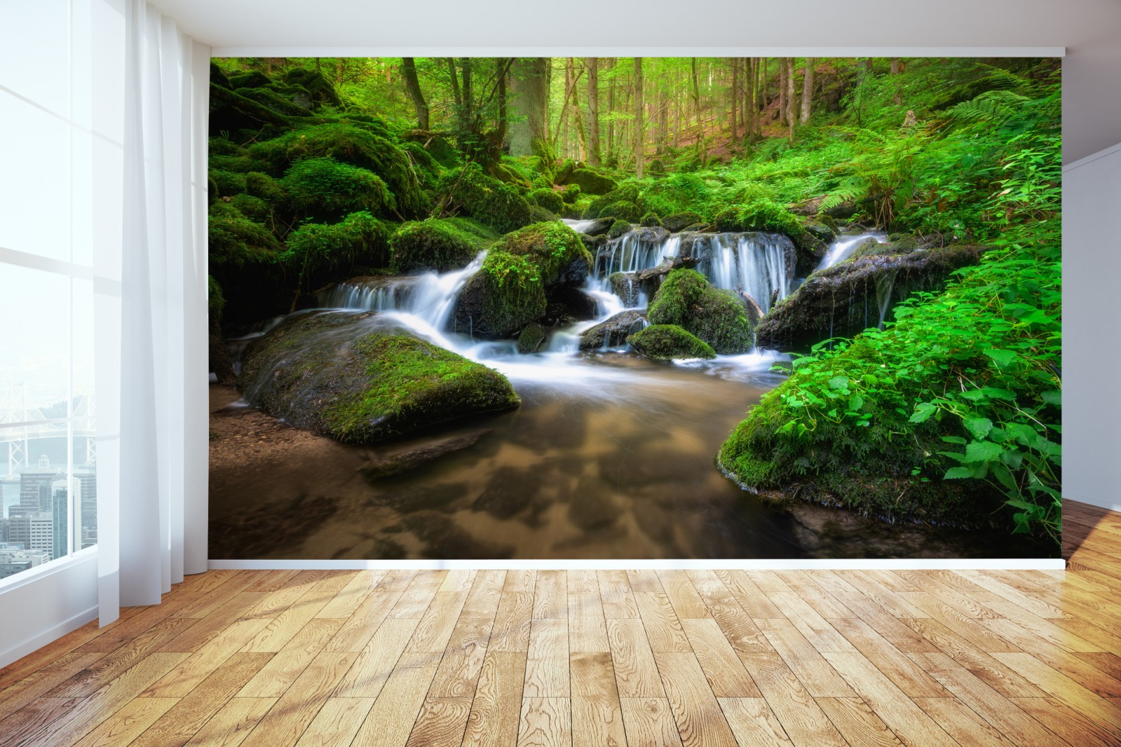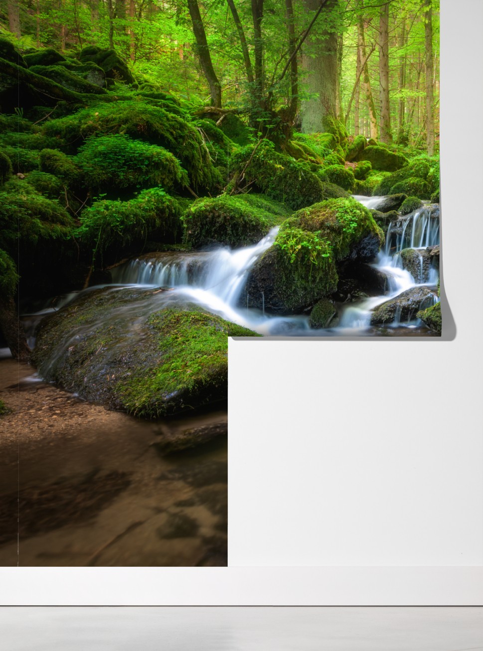 Bringen Sie die beruhigende Atmosphäre eines moosbedeckten Waldwasserfalls in Ihr Zuhause mit intensiven Grüntönen und sanftem Wasserrauschen.
