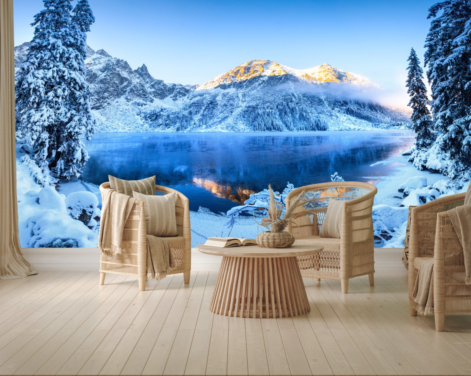 Fototapete Winterlicher sonnenaufgang über dem gefrorenen bergsee