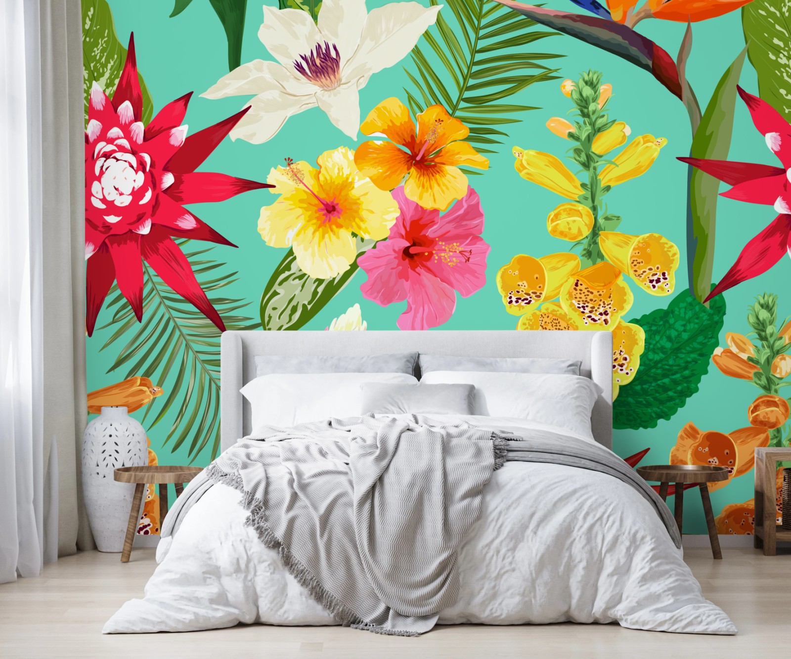 Fototapete Tropisches aquarell-blumenmuster mit hibiskus, tigerlilie und paradiesvogelblume