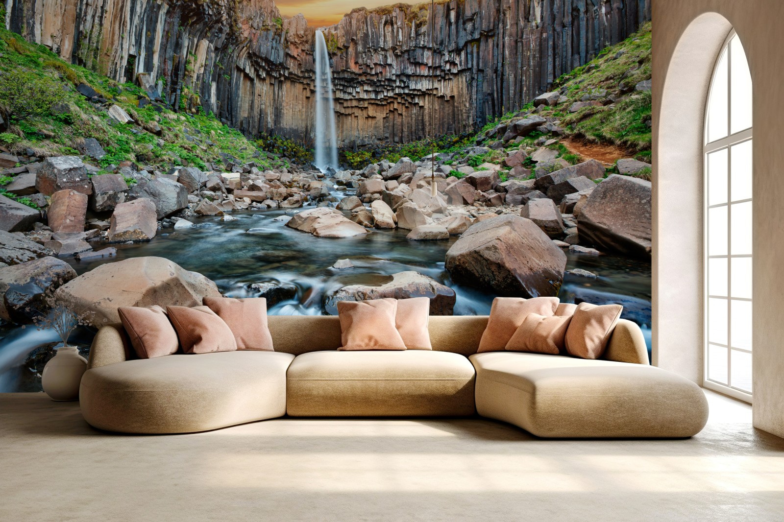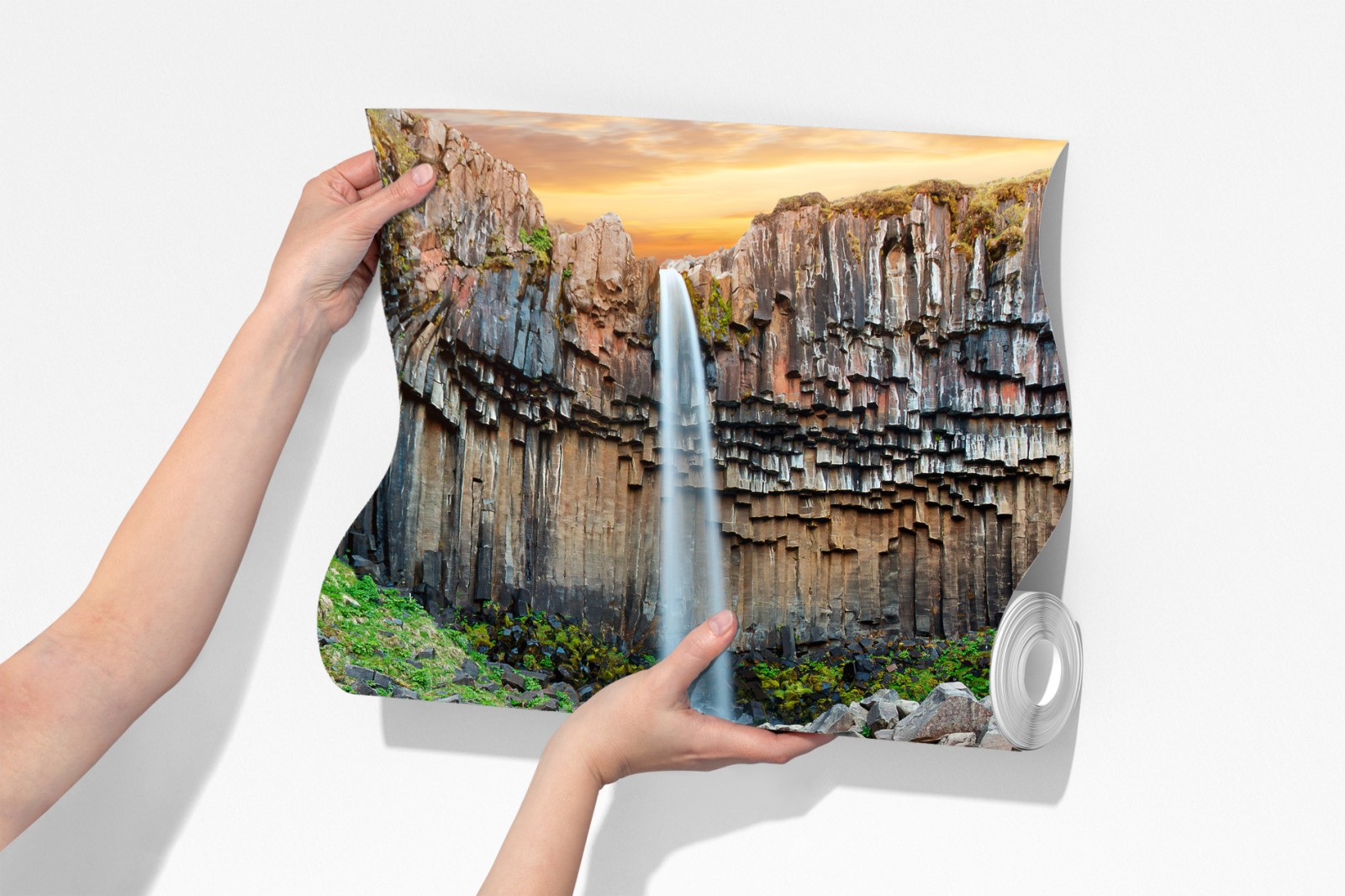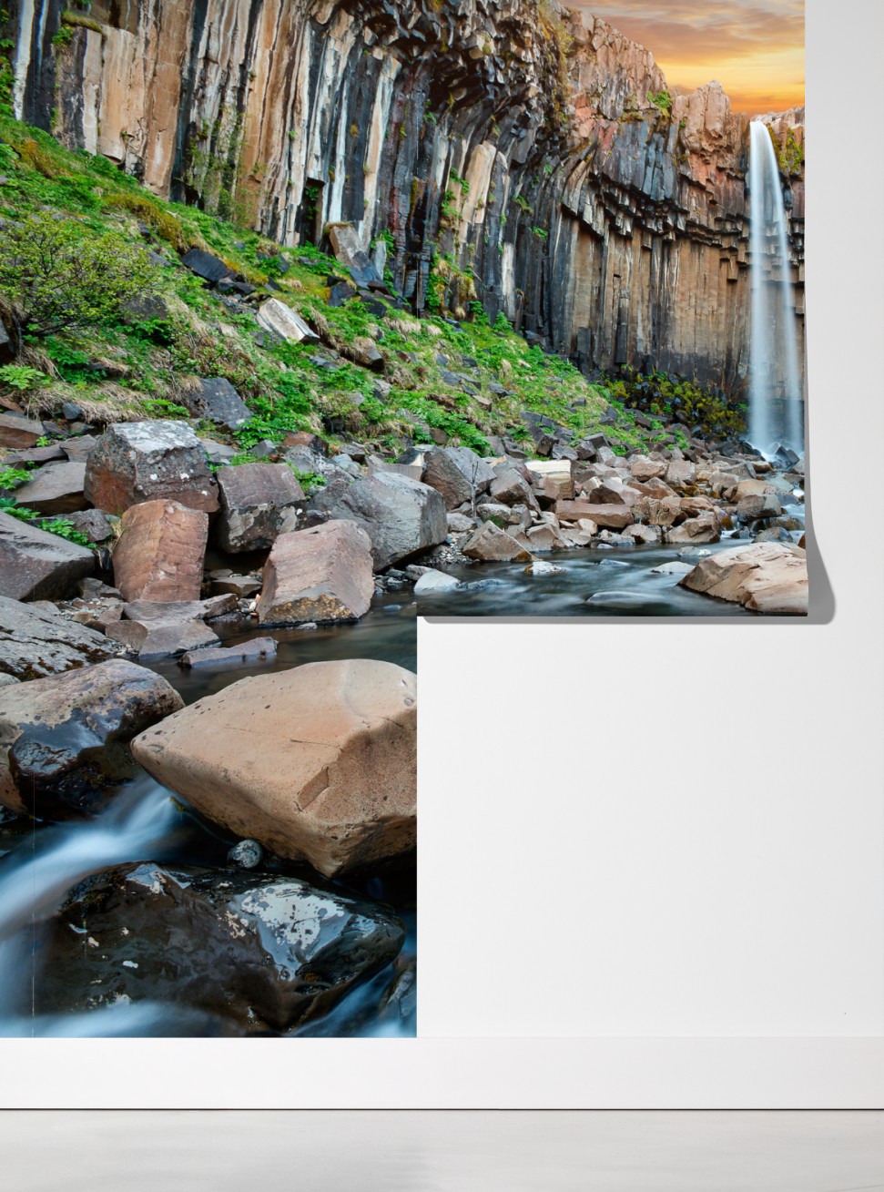 ein dramatischer wasserfall eingerahmt von sechseckigen basaltsäulen und einem wilden flusslauf, der natürliche schönheit in jeden raum bringt.