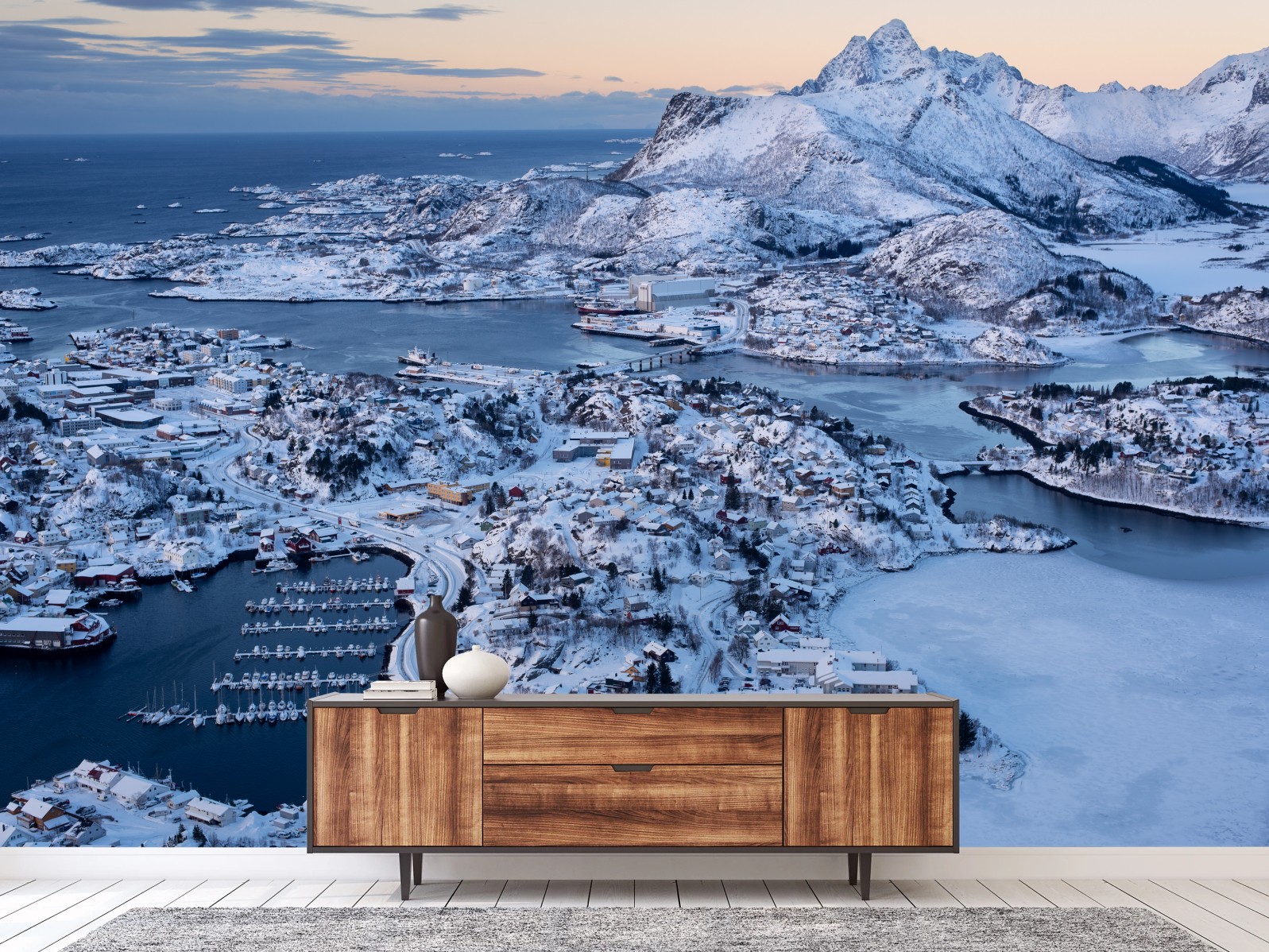 Fototapete Winterliche luftaufnahme des hafens von Svolvaer, Norwegen