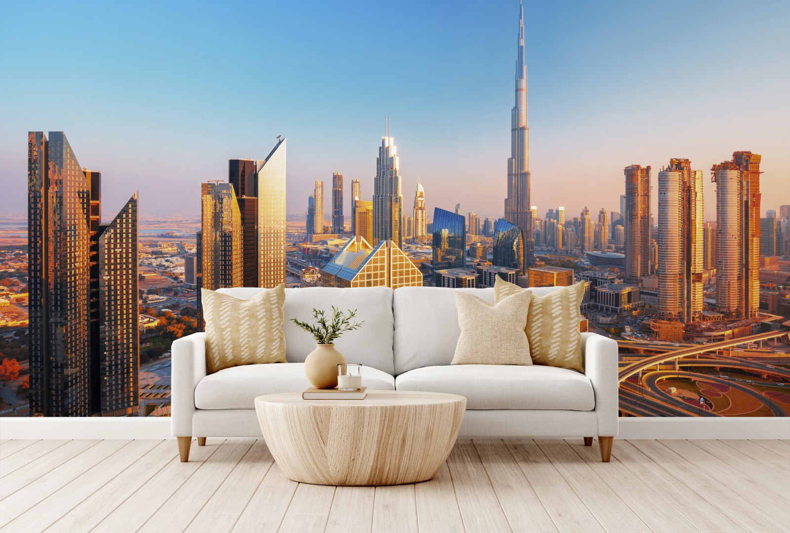 Beeindruckende Luftaufnahme der Dubai-Skyline mit dem ikonischen Burj Khalifa und weitläufigen Autobahnen im warmen Abendlicht, perfekt um modernen urbanen Charakter in jeden Raum zu bringen.MehrWeniger