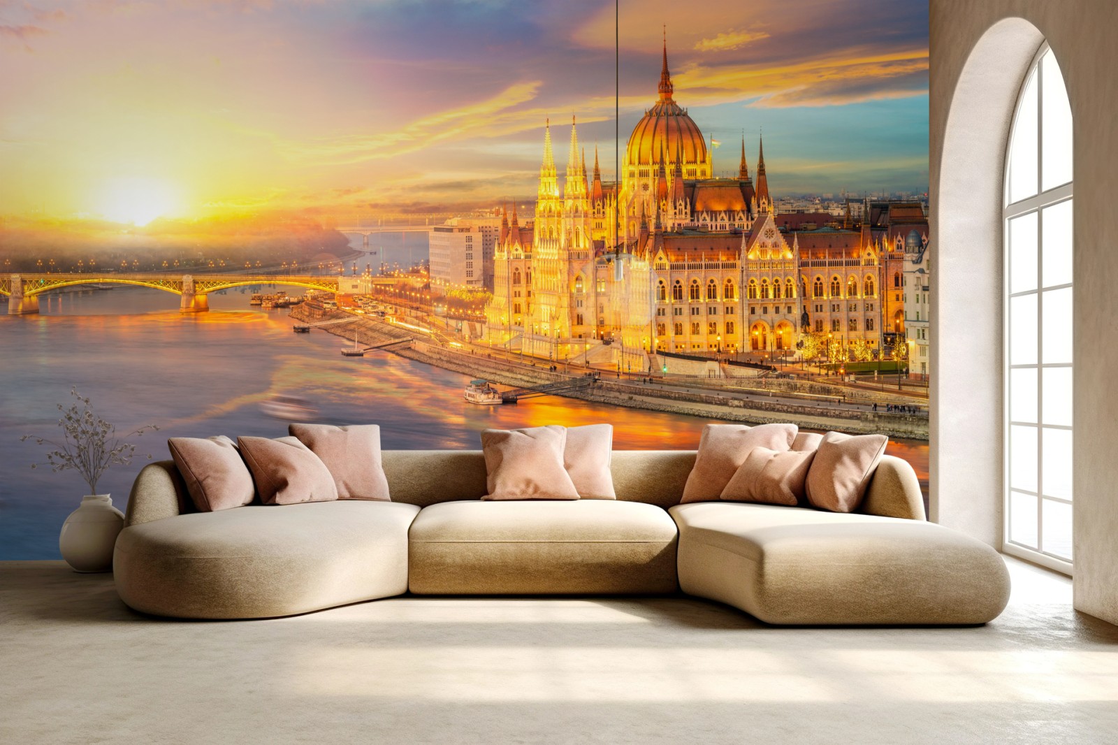 Fototapete Goldener sonnenuntergang über dem parlament von Budapest