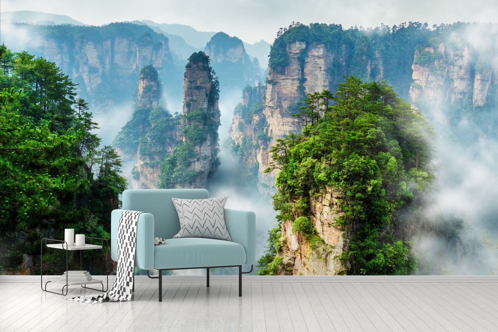 bringen sie ruhe in ihr zuhause mit dieser nebligen berglandschaft mit hohen felsenpfeilern und üppigem grün.MehrWeniger