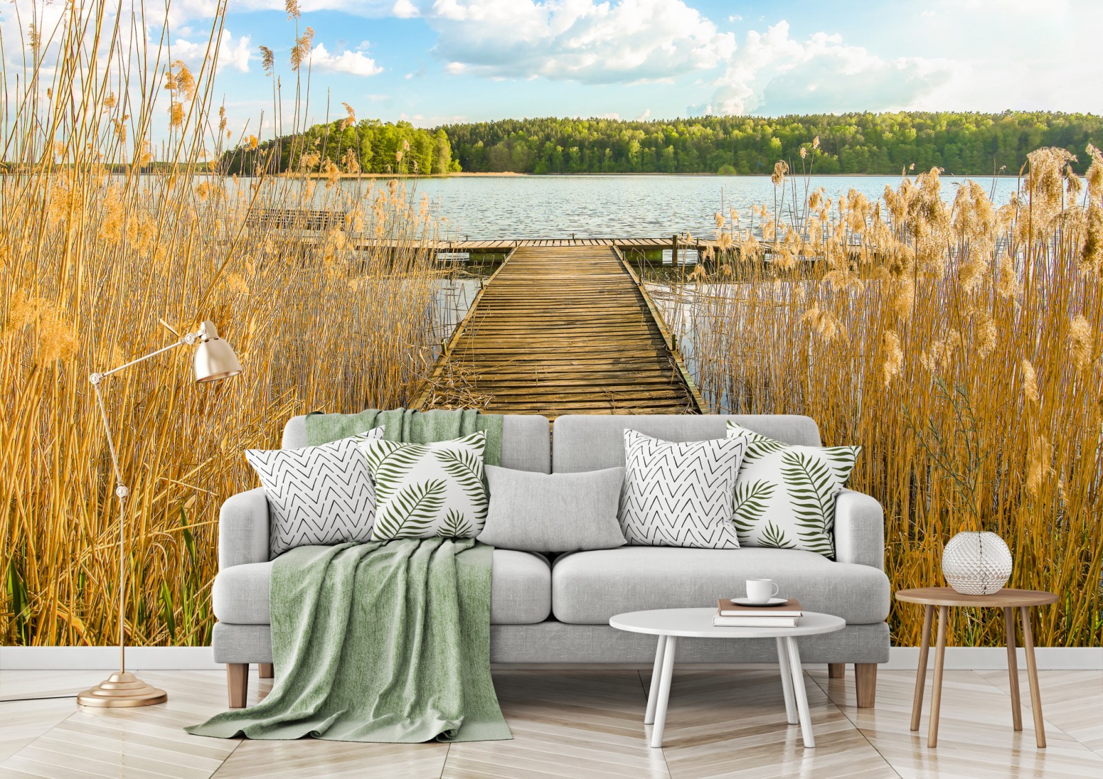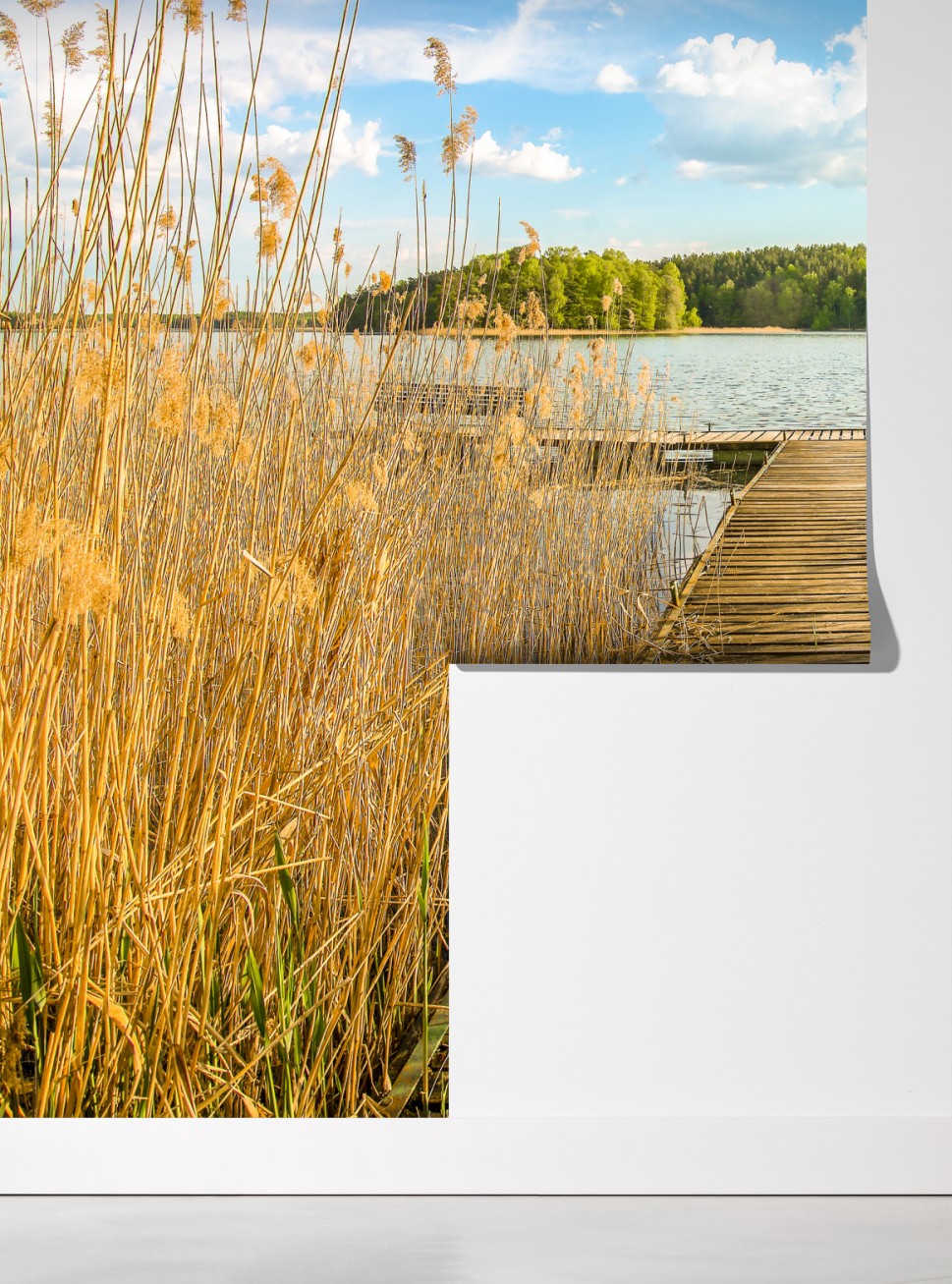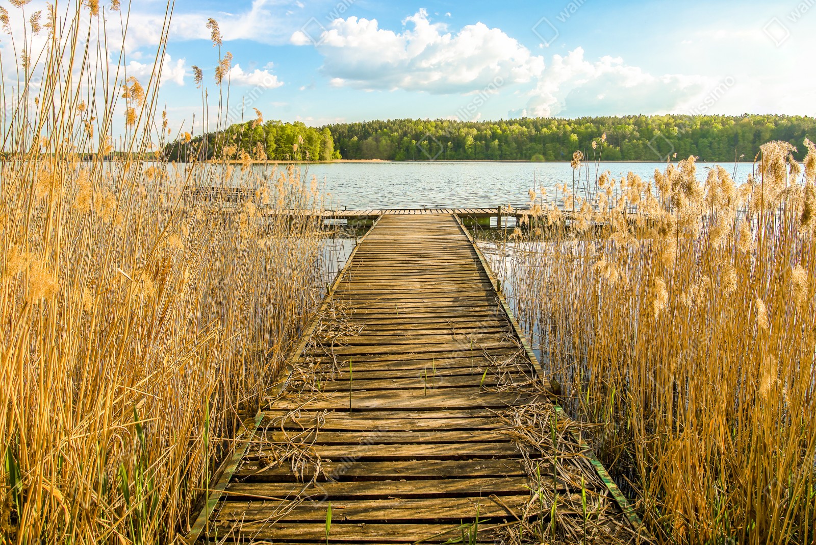 Eine ruhige Seenlandschaft mit einem verwitterten hölzernen Steg und goldenen Schilfhalmen, ideal, um natürliche Ruhe an Ihre Wände zu bringen.