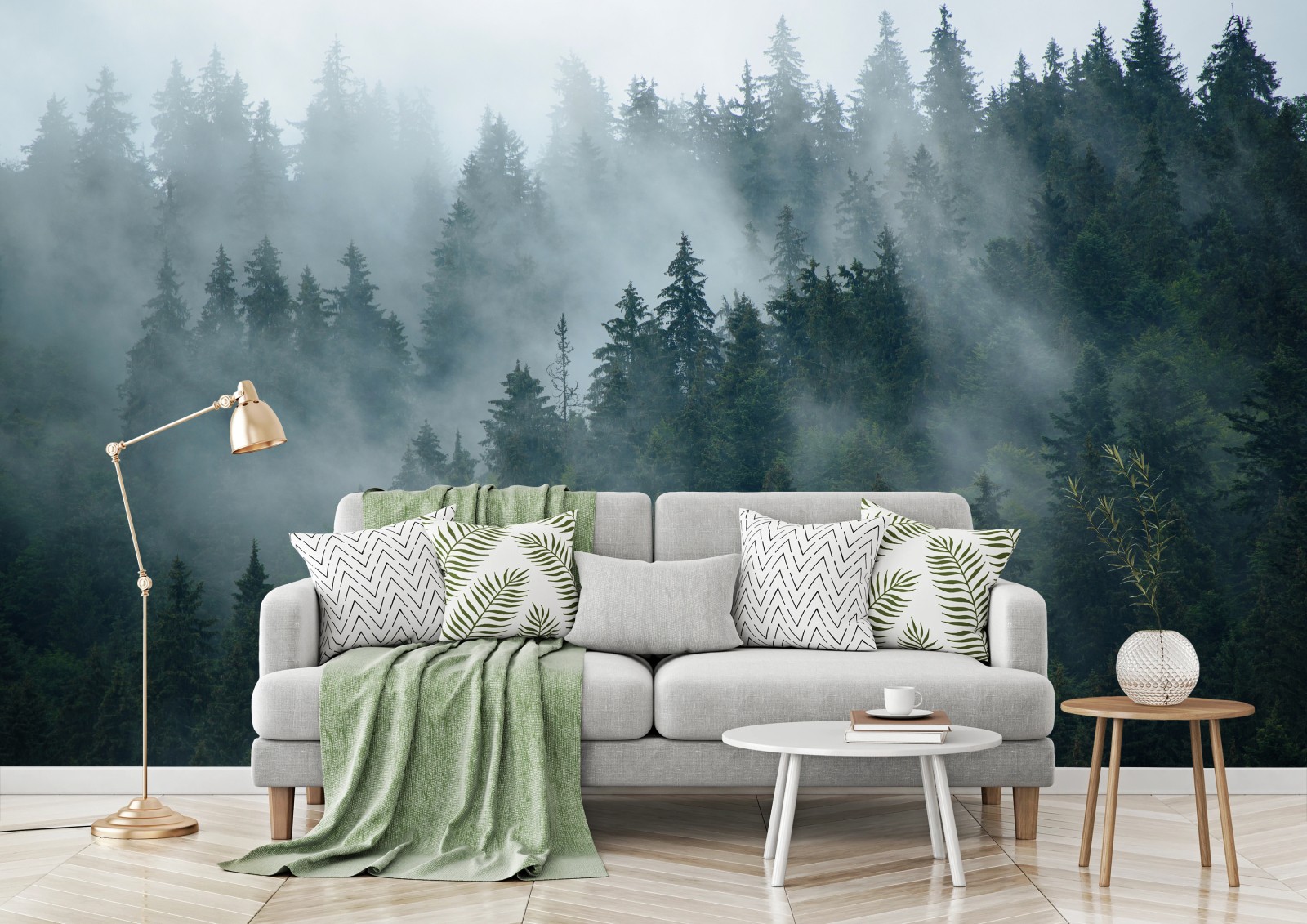 Ein ruhiges, nebeliges Bild eines immergrünen Waldes, das eine natürliche, entspannende Atmosphäre in jeden Raum bringt.MehrWeniger