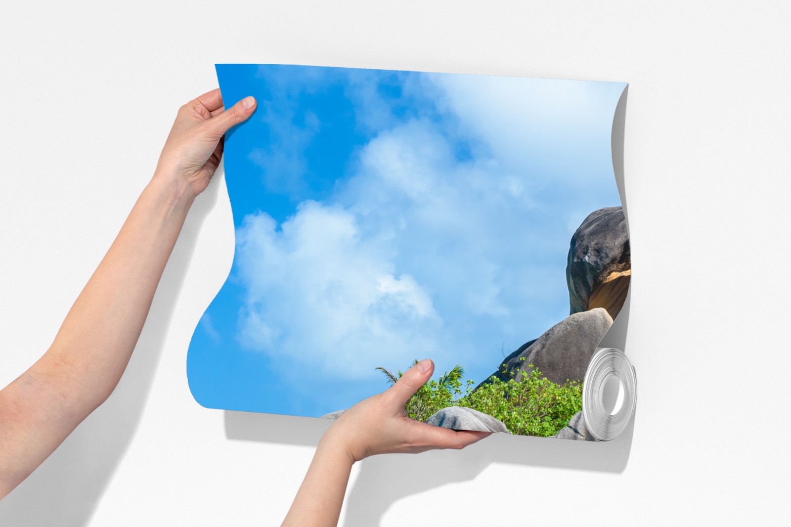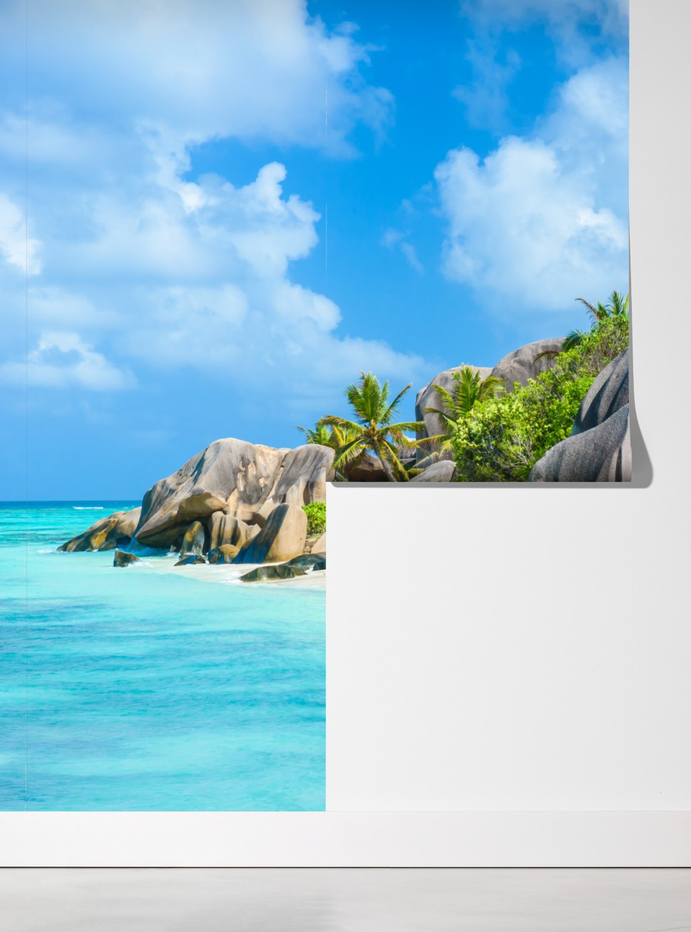 Eine ruhige tropische Strandlandschaft mit türkisfarbenem Wasser, beeindruckenden Granitfelsen und üppigen Palmen, die Inselsinnlichkeit in Ihr Zuhause bringt.