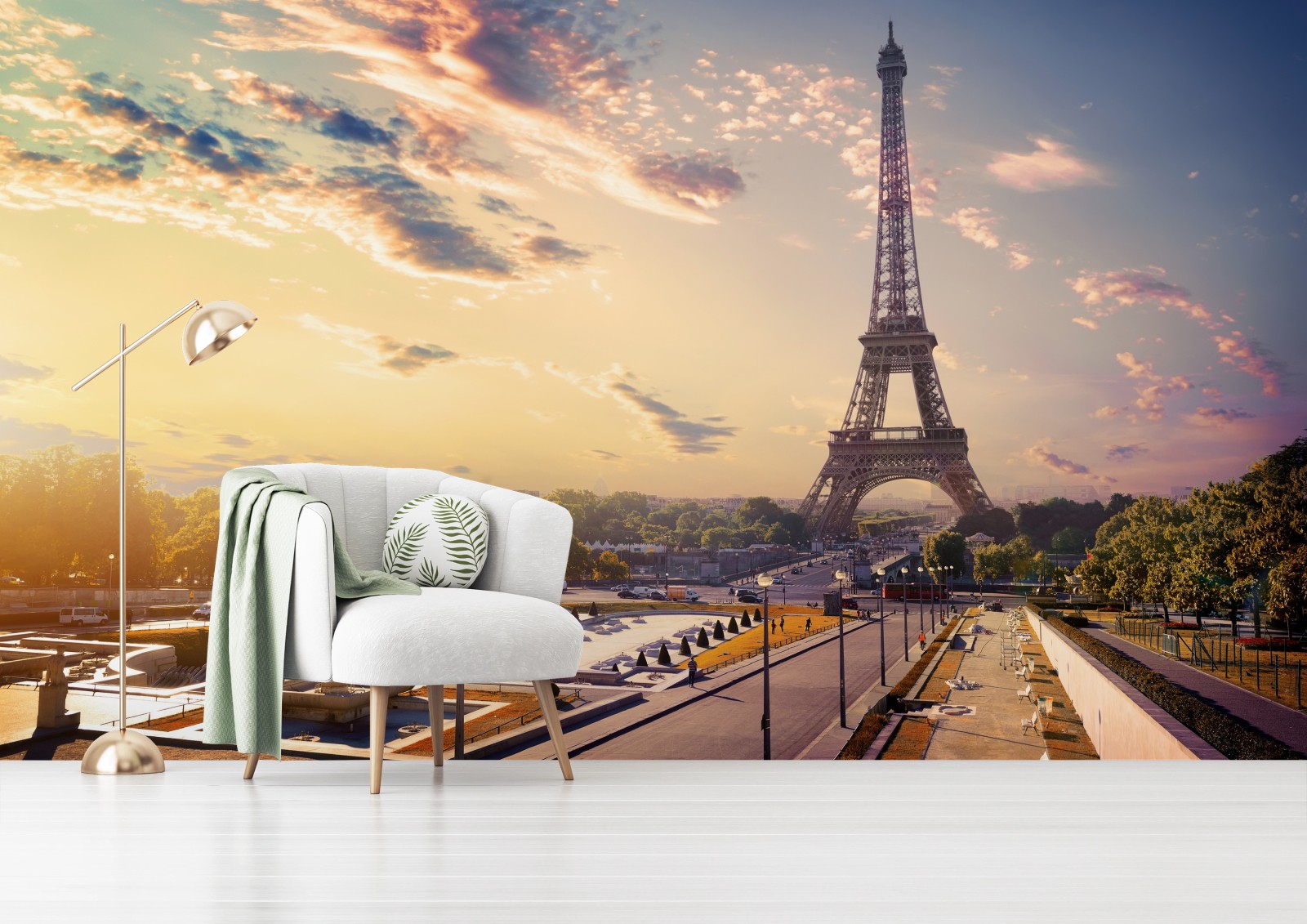 Fototapete Sonnenbeschienener blick auf den Eiffelturm bei dämmerung