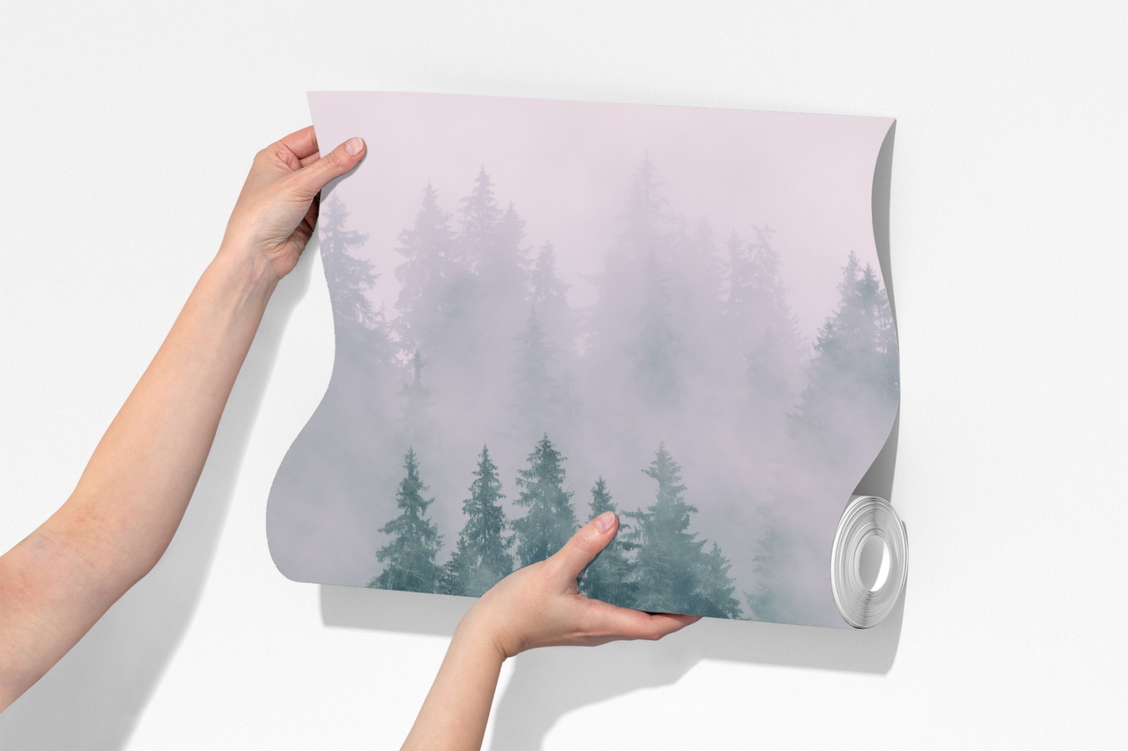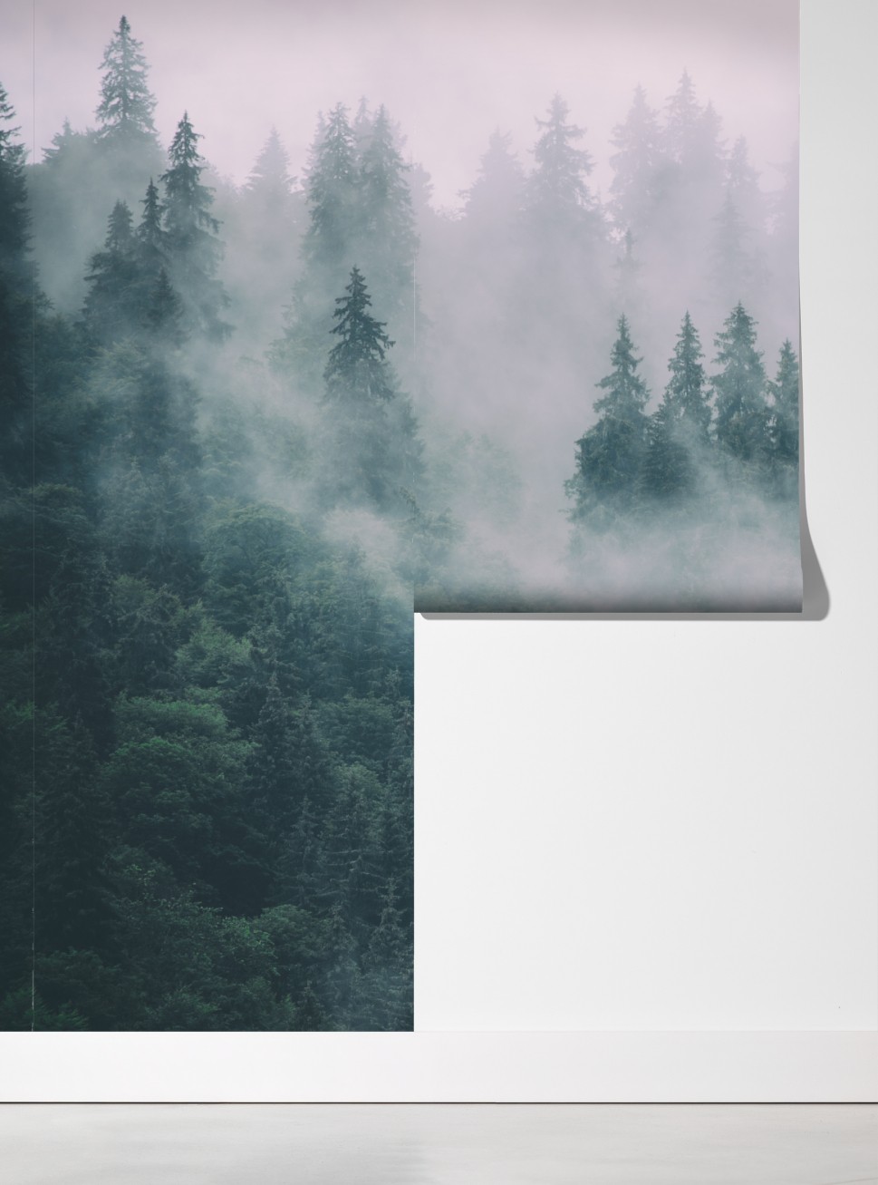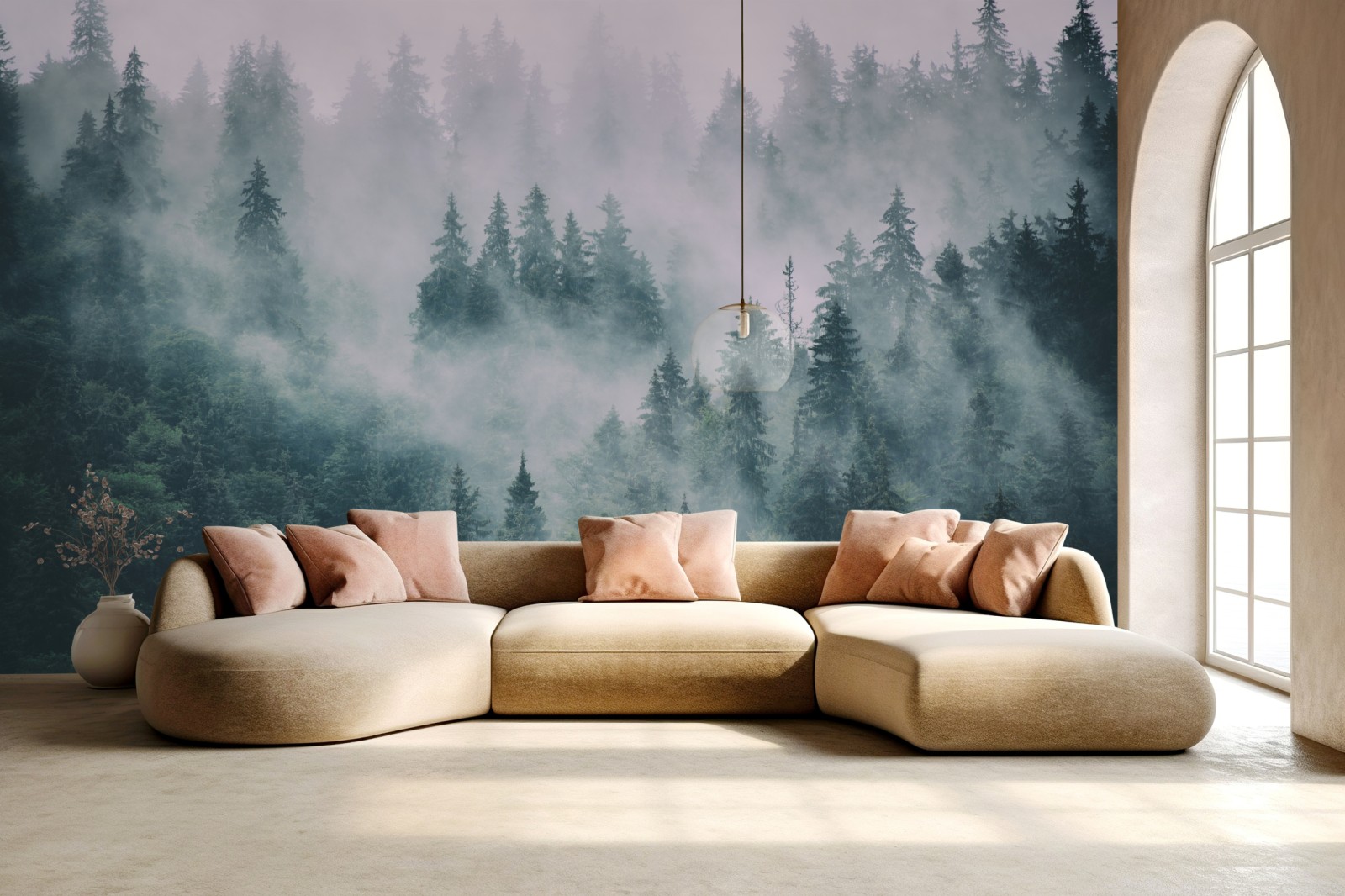 Bringen Sie Ruhe und Tiefe in Ihren Raum mit dieser nebligen Aufnahme eines immergrünen Waldes, die eine atmosphärische und beruhigende Stimmung schafft.